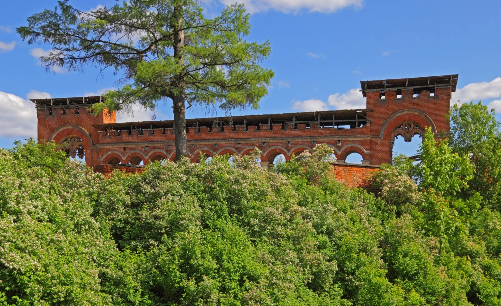Центральным элементом композиции является полуразрушенная кирпичная постройка из красного кирпича, выполненная в псевдоготическом стиле. Сооружение украшено характерными стрельчатыми и полукруглыми арками, а также декоративными элементами, отсылающими к средневековой европейской архитектуре. Данная постройка представляет собой один из многочисленных павильонов усадебного комплекса, создающих его неповторимый архитектурный облик.