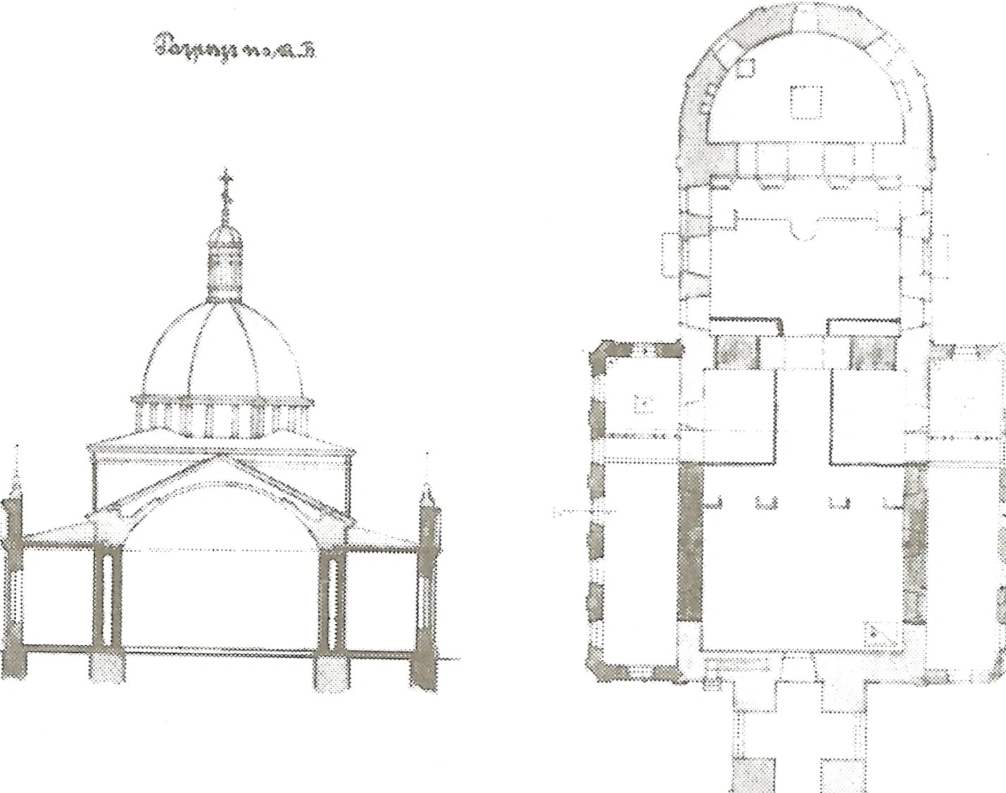 На представленном изображении запечатлён архитектурный чертёж храма Всех Святых на Соколе, входящего в комплекс Грузинского некрополя. Чертёж совмещает план этажа и поперечный разрез здания, что позволяет детально рассмотреть объёмно-пространственную композицию святыни.