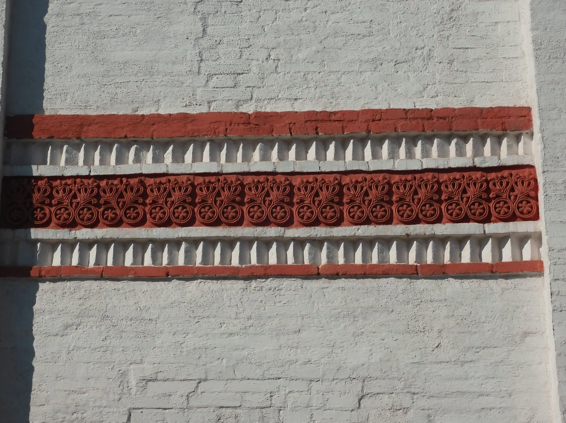Стена храма сложена из белого кирпича, что создает благородный и строгий облик. Вдоль фасада горизонтальной полосой проходит декоративный пояс, составляющий композиционный центр изображения. По краям его обрамляют две полосы из красного кирпича, создающие выразительный цветовой контраст.