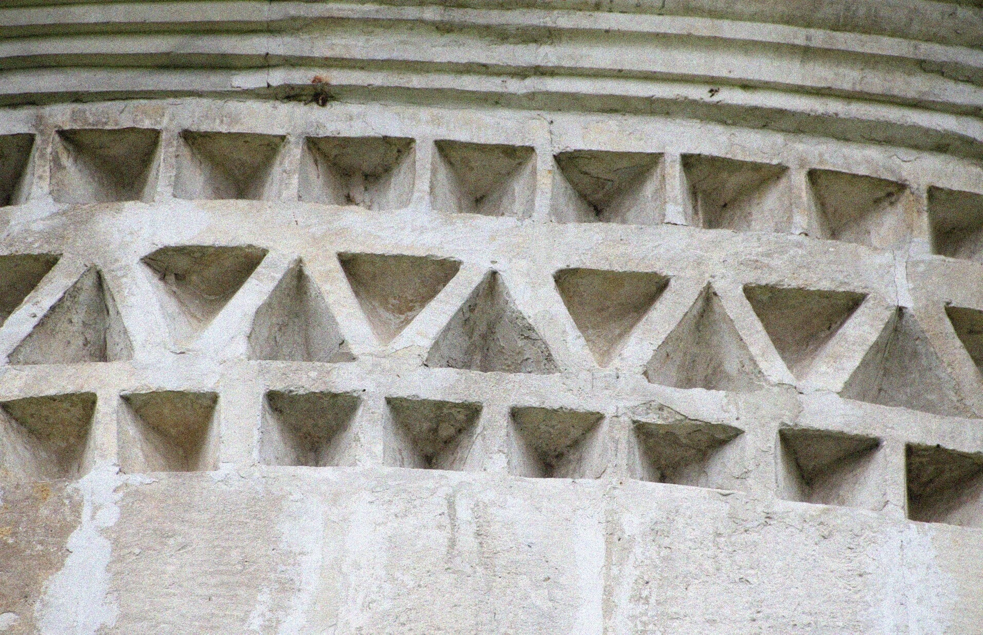 На представленной фотографии запечатлён фрагмент архитектурного декора Спасо-Преображенской церкви, расположенной в селе Остров (городской округ Орехово-Зуево). Изображённый элемент представляет собой образец высокохудожественной каменной резьбы, характерной для русского церковного зодчества. Речь идёт о рельефном орнаменте, известном как «шашки» или «диамондовый руст» — повторяющиеся четырёхугольные углубления пирамидальной формы, создающие богатую игру света и тени на фасаде храма.