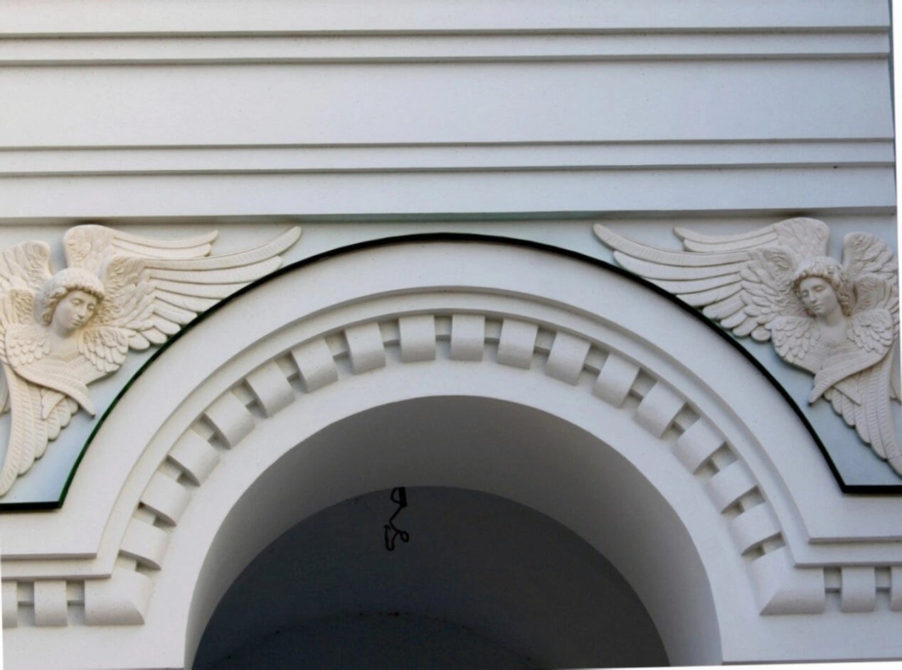 На представленной фотографии запечатлён фрагмент благолепного фасада Свято-Троицкого храма, что располагается в городе Батайске. Центральным элементом композиции является арочный проём, обрамлённый искусно выполненными рельефными деталями. По обе стороны от свода арки размещены выразительные барельефы, изображающие небесных бесплотных сил — ангелов и херувимов с воздетыми крылами, что является традиционным элементом украшения православных святынь.