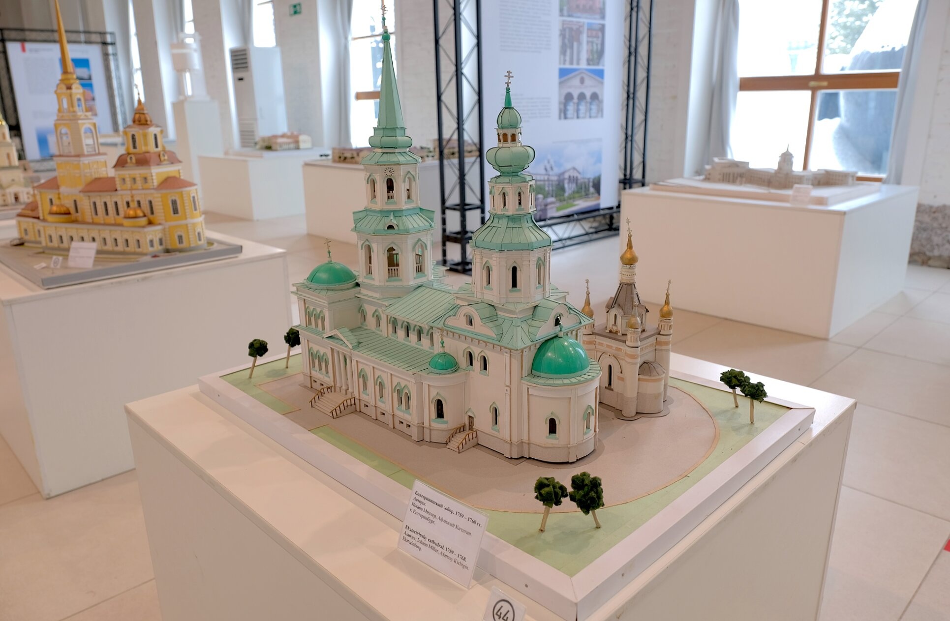 На представленной фотографии запечатлён детально проработанный макет воссозданного храма-колокольни во имя святого Иоанна Златоуста, известного в народе как Большой Златоуст. Святыня, первоначально освящённая в честь преподобного Максимилиана, являлась одним из самых высоких церковных сооружений дореволюционного Екатеринбурга и доминантой исторической застройки города.
