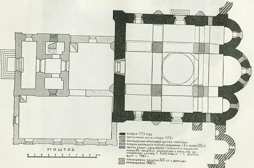 Основная часть плана, обозначенная тёмной заливкой, соответствует кладке 1175 года. Это время завершения строительства каменного храма, начатого по велению князя Романа Ростиславича в 1173 году. Утраченные фрагменты кладки 1173 года выделены светлой штриховкой, напоминая о первоначальном облике сооружения.