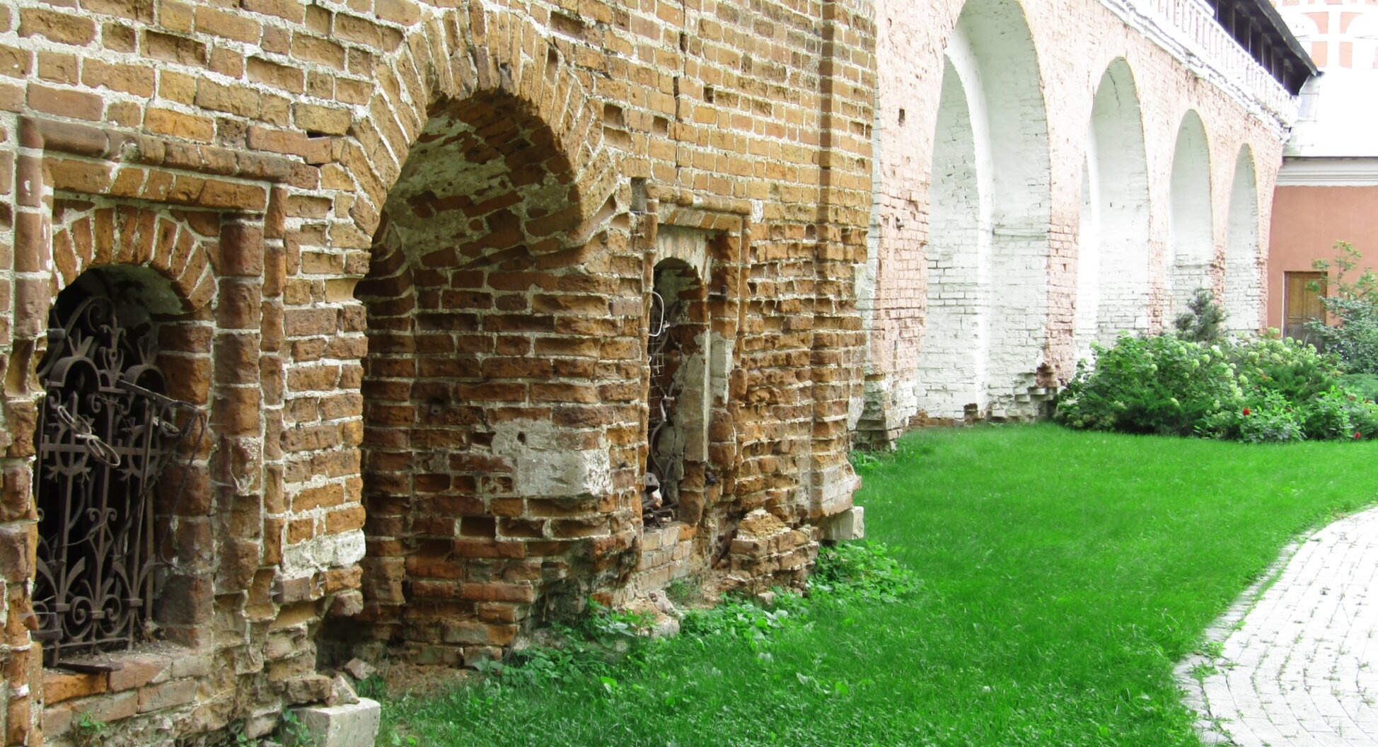 Слева видны арочные проёмы, один из которых закрыт кованой решёткой, что символизирует собой врата между мирской суетой и духовным уединением. Глубокая ниша с признаками естественного разрушения свидетельствует о почтенном возрасте святыни, пережившей многие исторические события. С правой стороны открывается вид на ухоженную территорию обители и светлые арки галереи, обрамляющей другой храм или корпус монастырского комплекса.
