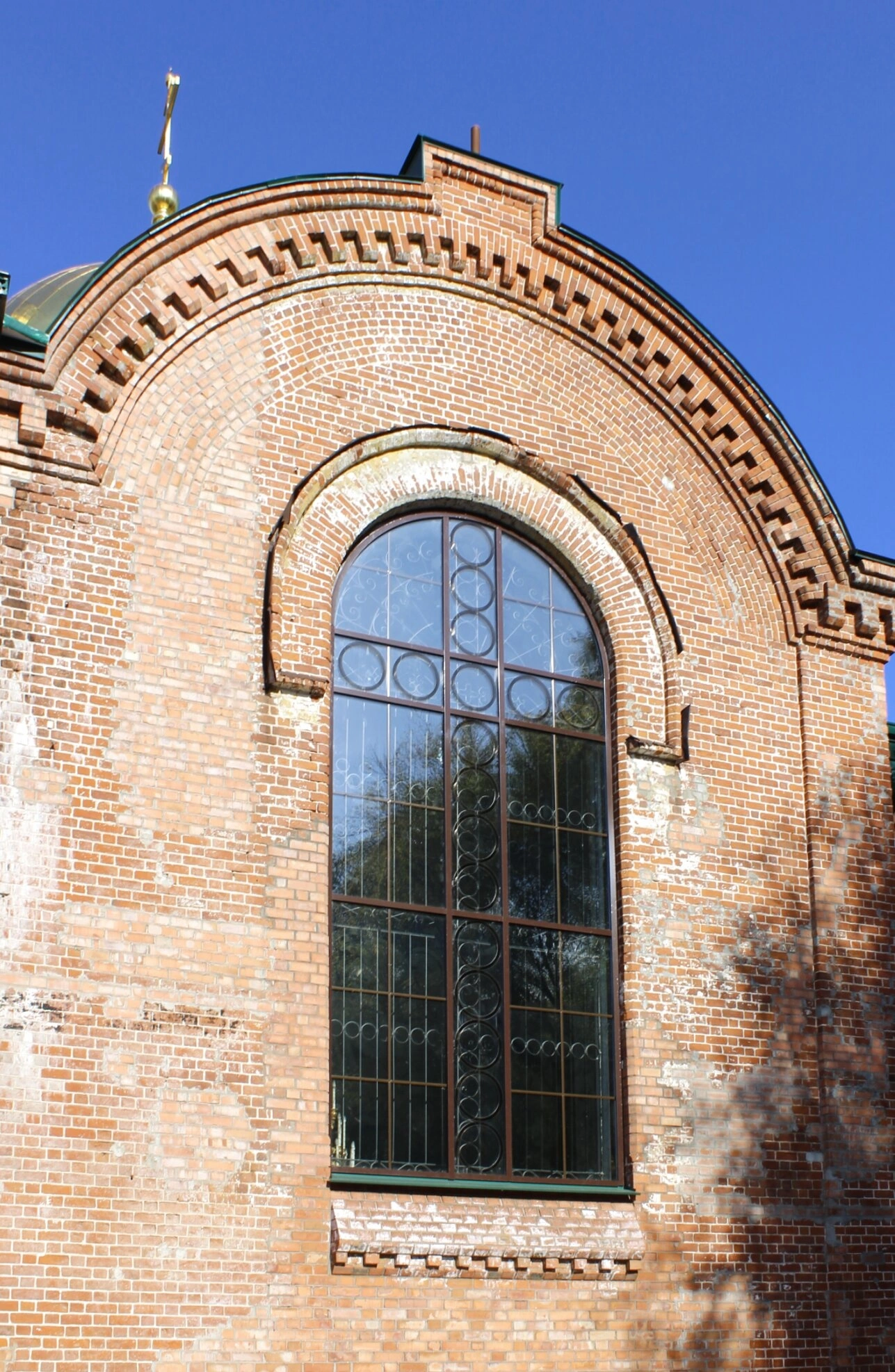 Окно, изображённое на снимке, представляет собой сложное архитектурное произведение. Его высокая арочная форма традиционна для православного зодчества и символизирует устремлённость человеческой души к горнему миру. Металлическая рама делит оконный проём на множество секций, в верхней части которых расположены круглые элементы, напоминающие небесные светила. В данных секциях historically размещались цветные витражи, наполнявшие внутреннее пространство храма одухотворённым, преображённым светом во время богослужений.