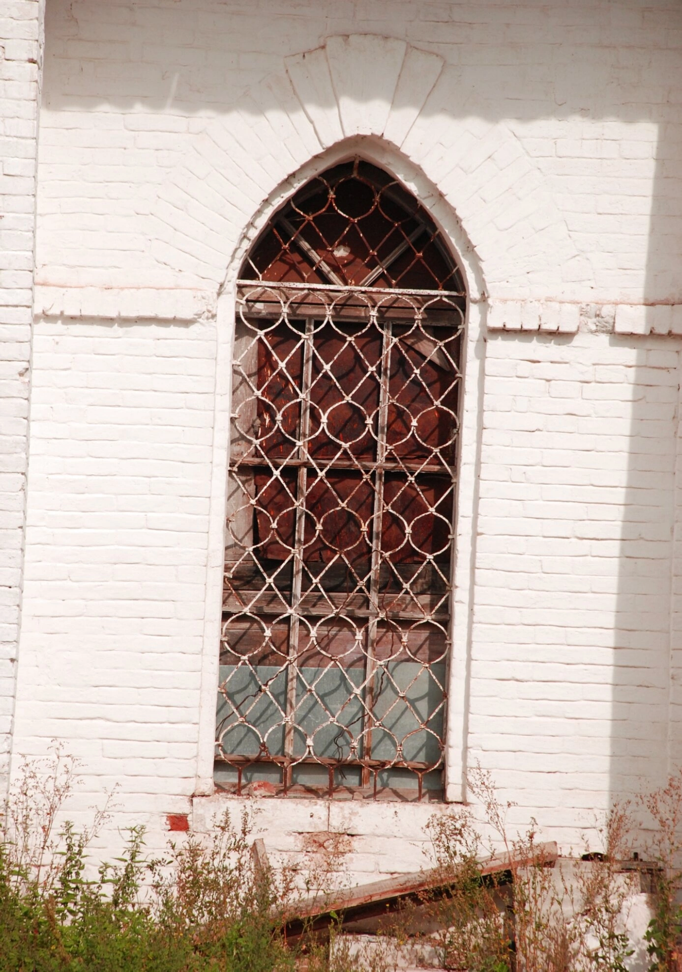 Белоснежная кирпичная кладка стены несёт на себе следы неизбежного течения времени: облупившаяся краска, потертости и участки разрушения в нижней части, что придаёт образу величие и благородную скорбь. За решёткой просматривается тёмное пространство некогда освящённого храмового помещения, ныне пребывающего в забвении.