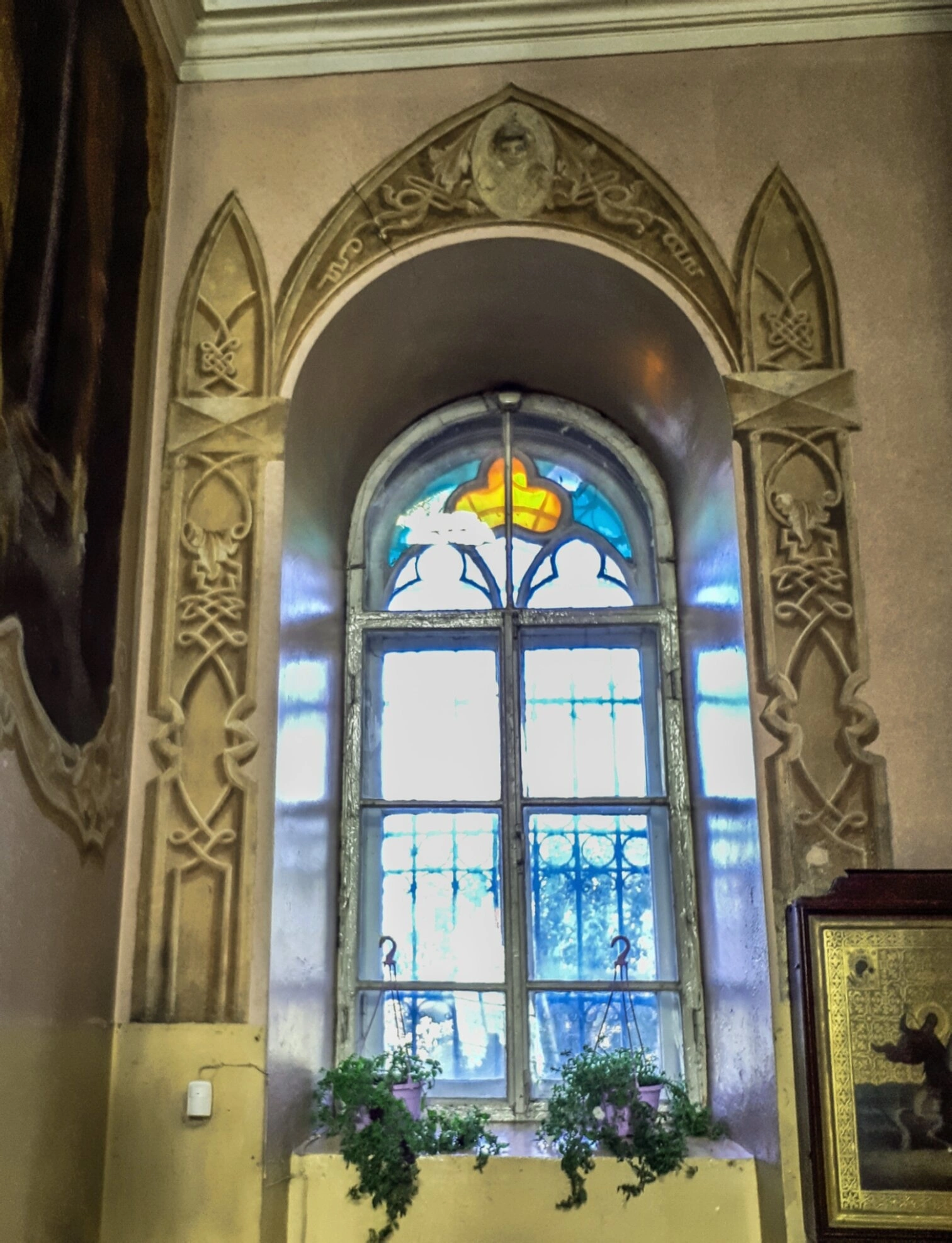 Верхняя, арочная часть окна осенена цветным витражом, выполненным из стёкол благоговейных оранжевых и зелёных оттенков. Через эти стёкла в священное пространство храма проникает божественный свет, создающий особую, молитвенную атмосферу и играющий бликами на окружающих поверхностях. Витражное остекление является характерным элементом храмовой архитектуры конца XIX — начала XX столетия.