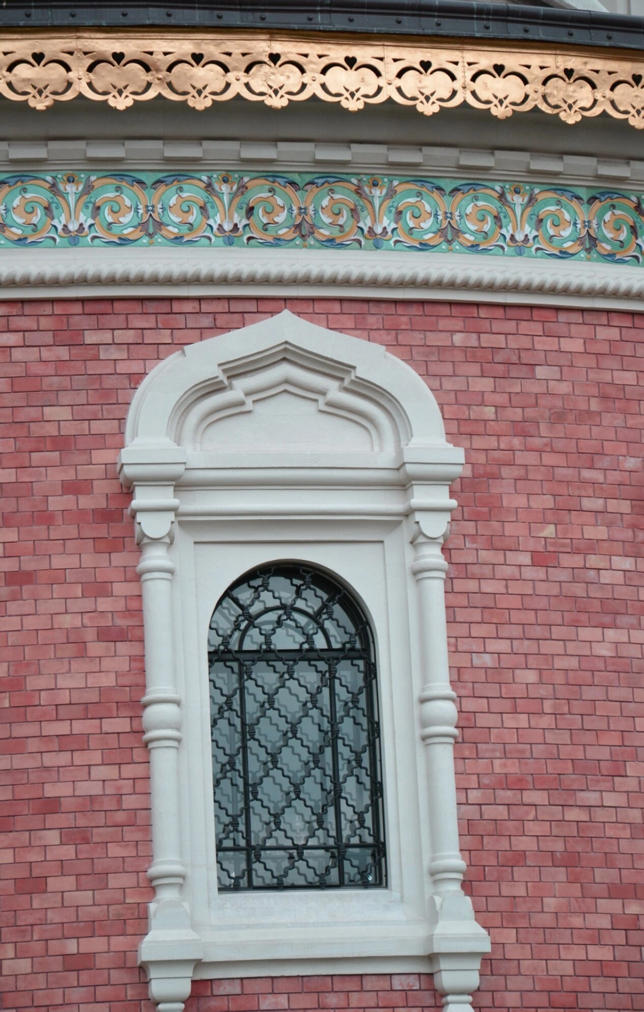 Конструкция окна представляет собой высокую стрельчатую арку, обрамлённую декоративными пилястрами и изящной лепниной светлого оттенка, которая эффектно контрастирует с тёплым терракотовым цветом кирпичной кладки. Кованая металлическая решётка, украшающая проём, выполнена с применением сложного узорчатого орнамента, что свидетельствует о высоком мастерстве кузнецов и общем стремлении к созданию благолепного образа дома Божия.