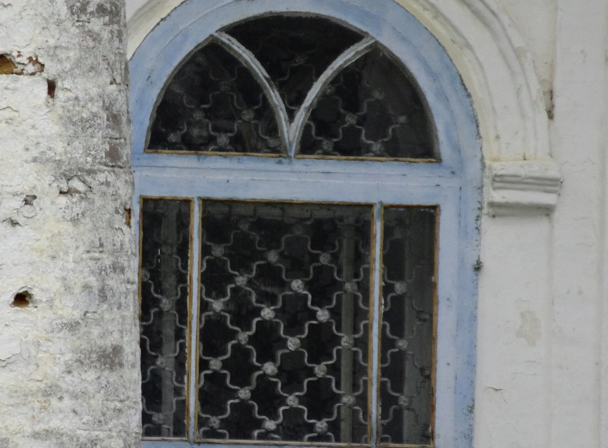Окно, изображенное на снимке, демонстрирует характерные для православной храмовой архитектуры элементы. Двухчастная арочная конструкция верхней части, завершающаяся изящным полукружием, символизирует устремленность души к горнему миру. Деревянная рама, окрашенная в голубой цвет — традиционный для украшения церковных строений оттенок, олицетворяющий небесную чистоту и Божию благодать. Следы облупившейся краски и штукатурки свидетельствуют о почтенном возрасте сооружения и говорят о необходимости бережной реставрации.