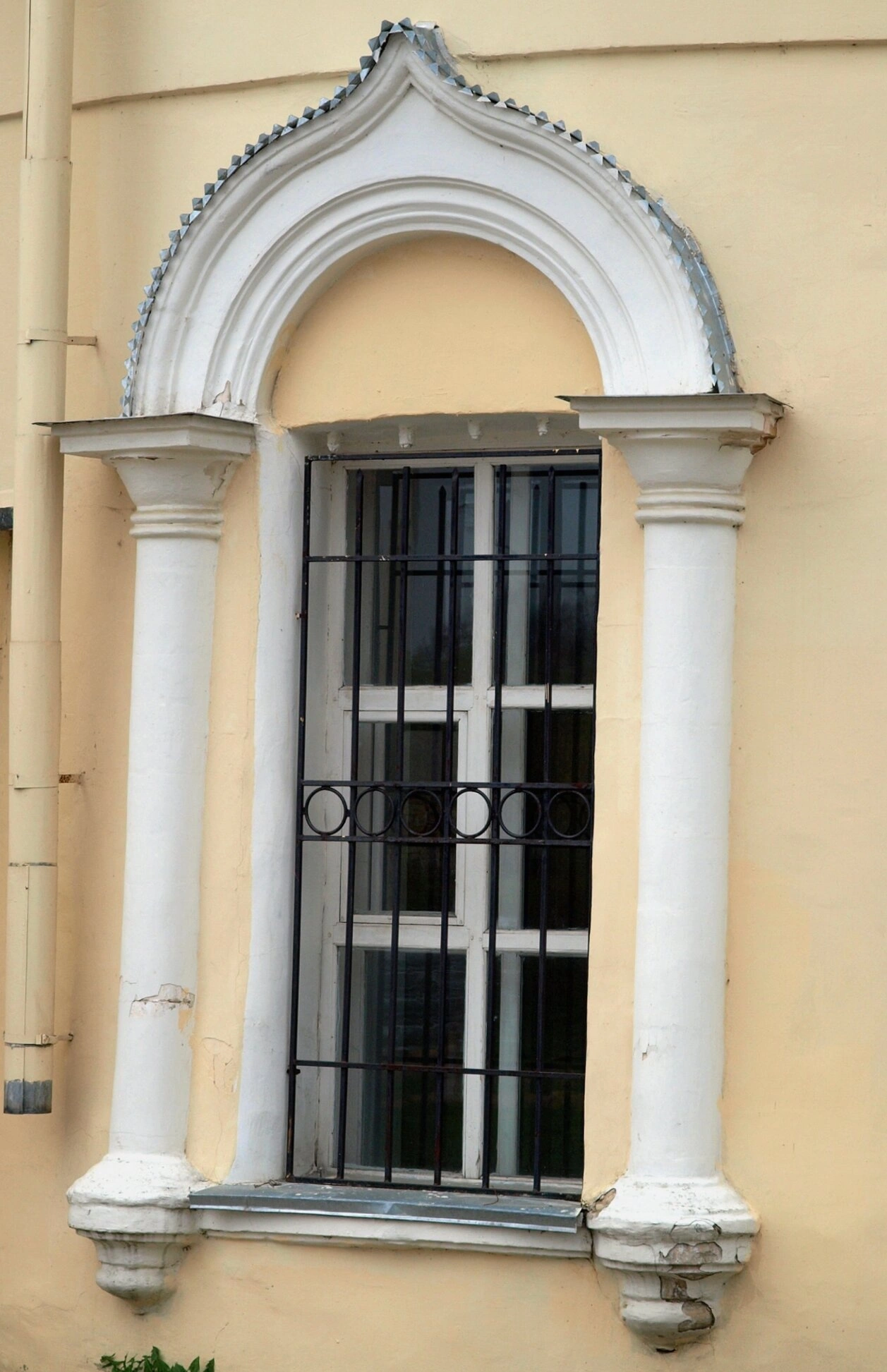 Окно, изображенное на снимке, демонстрирует характерное для храмового зодчества того времени оформление. Арочный проем венчает изящный белокаменный наличник, над которым расположен декоративный фронтон, по своей форме напоминающий традиционный русский кокошник. Этот элемент придает оконному проему особую торжественность и устремленность ввысь, к небесам. По бокам оконный проем фланкируют стройные пилястры с капителями, выполняющие роль колонн и визуально поддерживающие арочное завершение.
