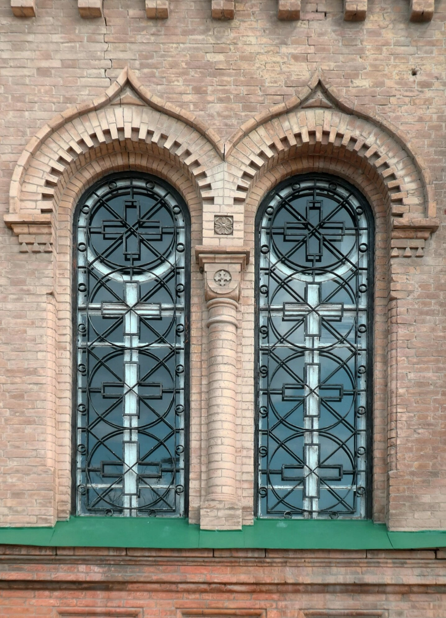 Окна украшены благолепными коваными решетками, искусно выполненные мастерами-кузнецами. В их орнаменте доминирует образ креста — главного символа христианской веры, что придает всему облику храма глубокое духовное звучание. Решетки не только выполняют функцию защиты, но и служат украшением, подчеркивая сакральное назначение здания.
