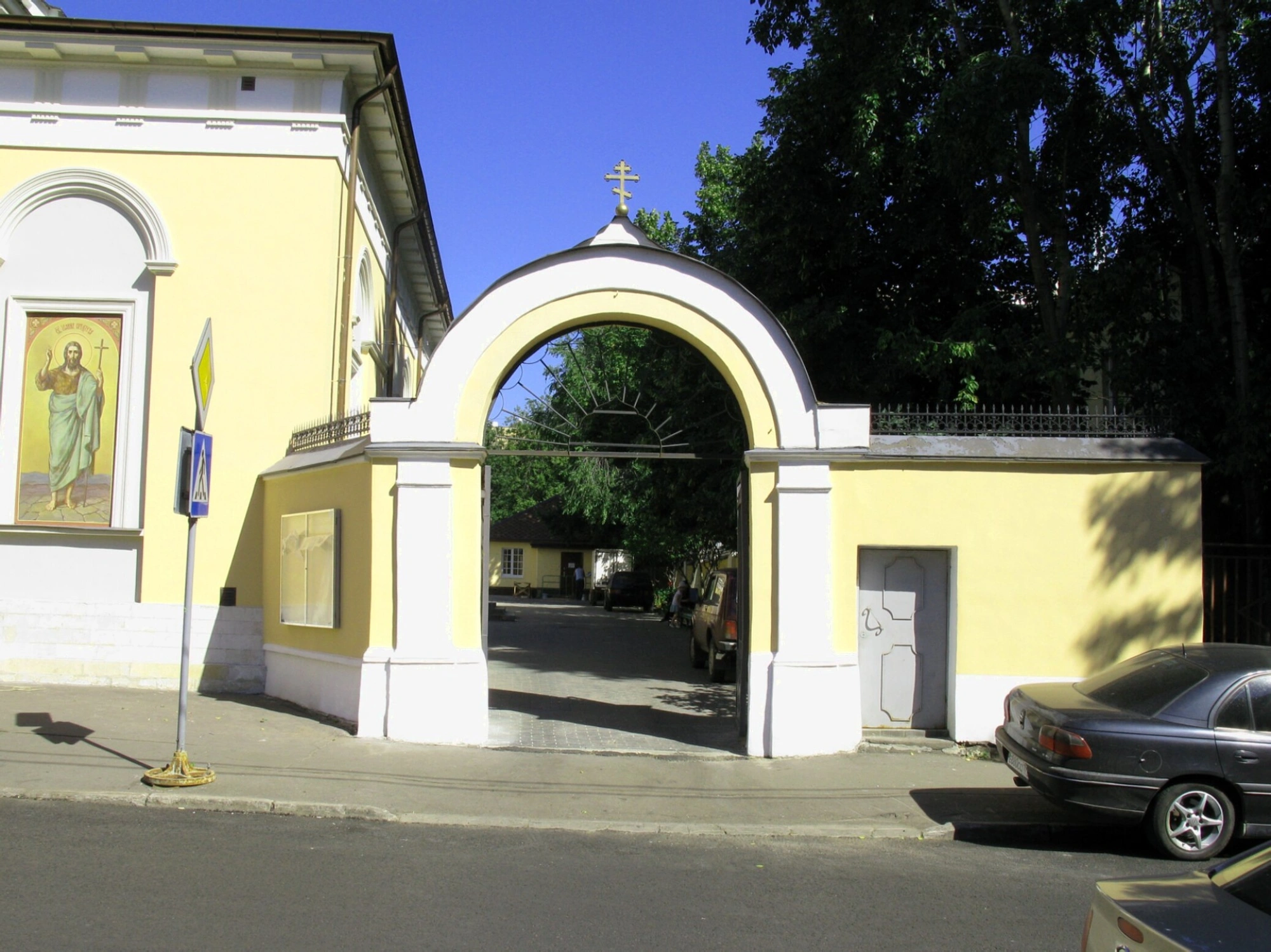 На представленной фотографии запечатлен арочный вход на территорию храма Рождества Иоанна Предтечи, что расположен в историческом районе Пресня города Москвы. Святыня, возведенная в стиле классицизма, является значимым памятником церковной архитектуры и духовным центром православной Москвы.
