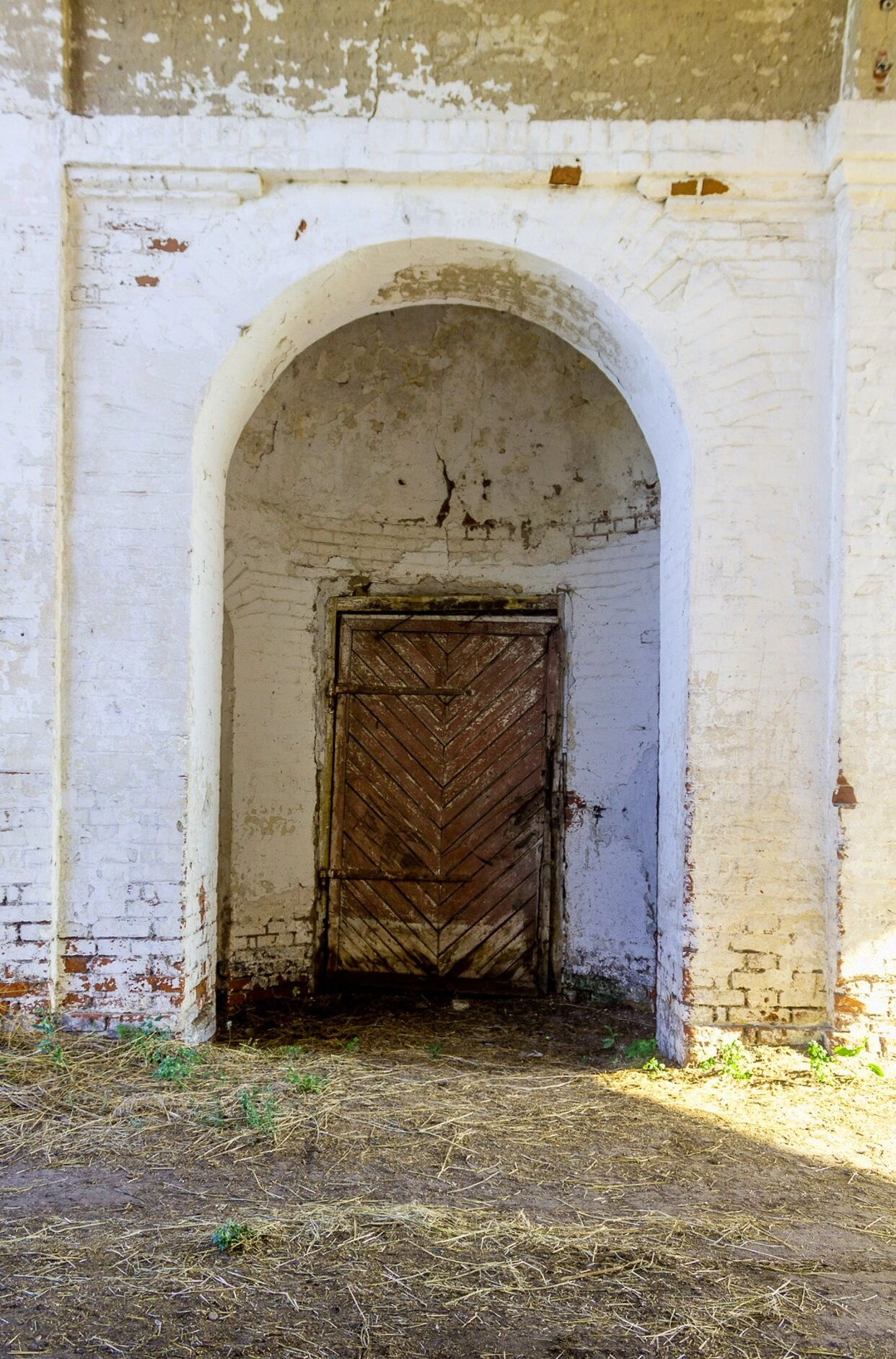 В глубине сводчатого проема расположена старинная деревянная дверь, собранная из досок, уложенных в диагональном направлении. Древесина имеет темный, выцветший от времени оттенок, а металлические элементы, включая кованые петли и замковые механизмы, покрыты слоем патины. Подобные конструктивные особенности характерны для входных групп храмовых комплексов Русской Православной Церкви.
