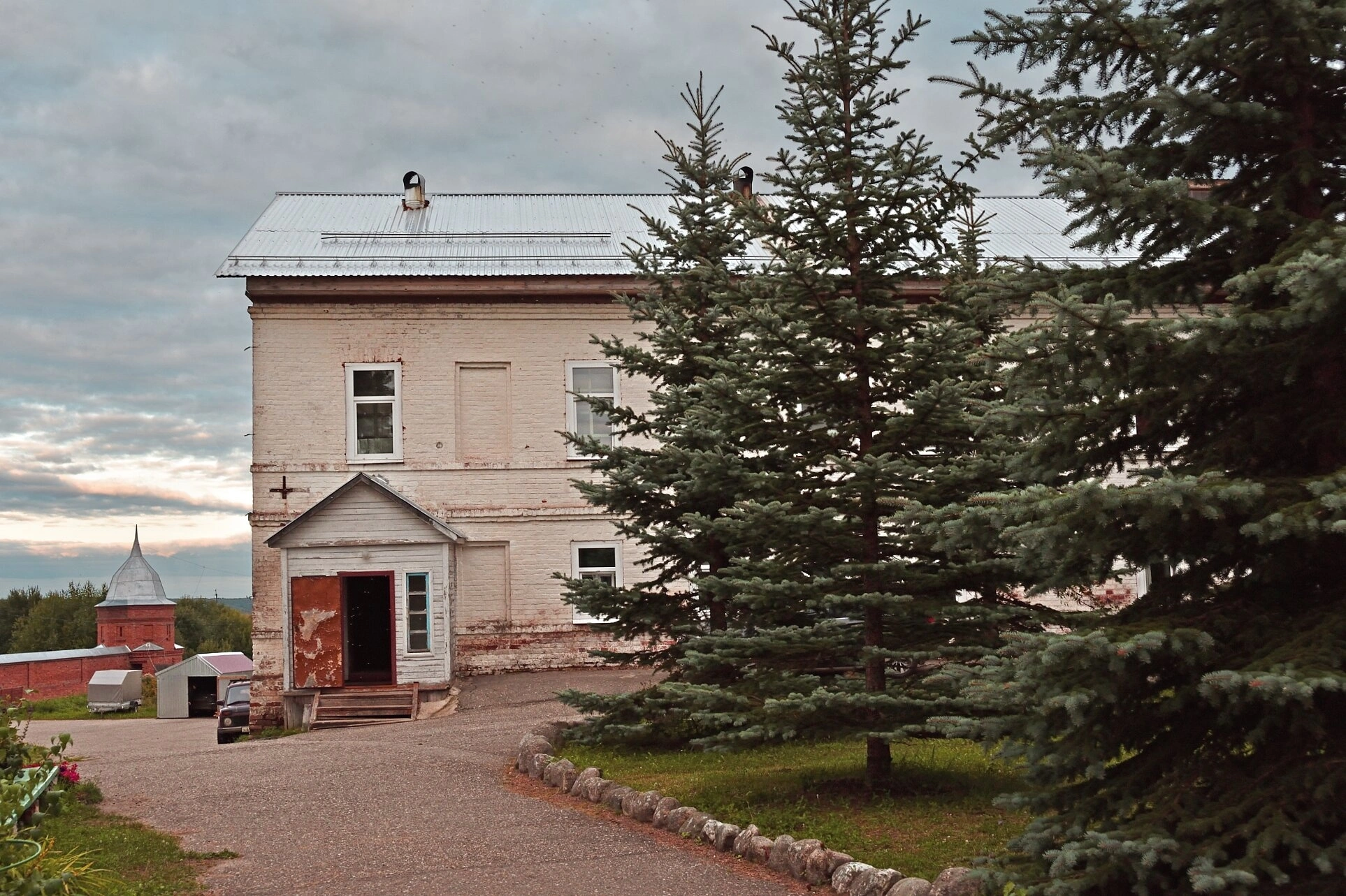 Перед зданием возвышаются две величественные ели, символизирующие духовную стойкость и вечную жизнь. От строения отходит мощёная дорожка, ведущая к другим монастырским постройкам, что создаёт ощущение единства архитектурного ансамбля. На заднем плане чётко просматривается фрагмент монастырской ограды с башней, напоминающей о былых временах, когда обитель выполняла и оборонительные функции.