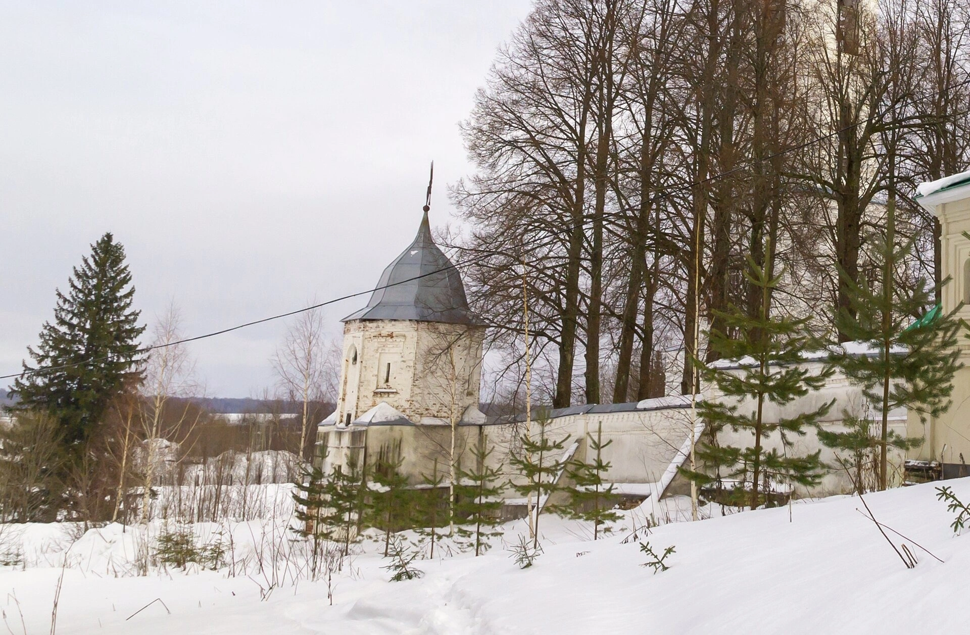 На снимке виднеется часть монастырской стены и угловая башня, увенчанная православным куполом-маковкой. Архитектурный ансамбль монастыря, формировавшийся на протяжении нескольких столетий, представляет собой выдающийся памятник церковного зодчества. Монастырь был основан в XIV веке преподобным Авраамием Чухломским, учеником великого Сергия Радонежского, и является одной из самых почитаемых святынь Костромской земли.