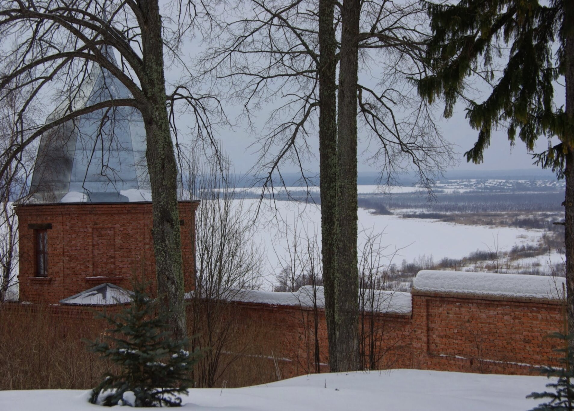 На представленной фотографии запечатлён величественный зимний пейзаж Авраамиево-Городецкого монастыря, расположенного вблизи села Ножкино Костромской области. На переднем плане изображён заснеженный склон с несколькими деревьями, лишёнными листвы, и одним небольшим хвойным деревом, символизирующим вечную жизнь в православной традиции. Слева возвышается часть кирпичного строения с куполом, характерным для церковной архитектуры, окружённого защитной кирпичной стеной, которая ограждает священное пространство монастыря от мирской суеты.