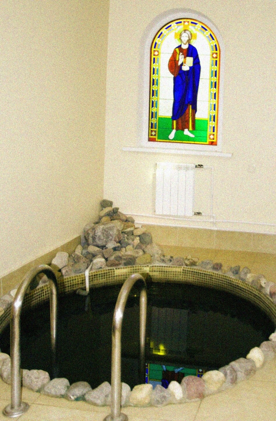 Над купелью расположено арочное окно, украшенное художественным витражом, на котором изображён лик святого. Этот витраж, пропускающий дневной свет, наполняет пространство божественным сиянием и служит напоминанием о небесном заступничестве во время таинства. Под окном, не нарушая гармонии интерьера, размещён радиатор отопления, обеспечивающий поддержание благоприятной температуры в помещении в любое время года.