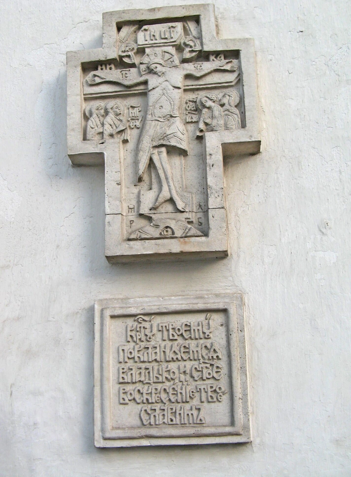 В нижней части барельефа, под сценой Распятия, находится отдельная каменная плита с вырезанным на ней текстом молитвы. Надпись, выполненная в старославянской традиции, содержит священные слова, известные каждому православному христианину: «Кресту Твоему поклоняемся, Владыко, и Святое Воскресение Твое славим». Эта фраза является неотъемлемой частью богослужебного чина и выражает суть христианского вероучения — поклонение Кресту как орудию спасения и прославление победы Христа над смертью.