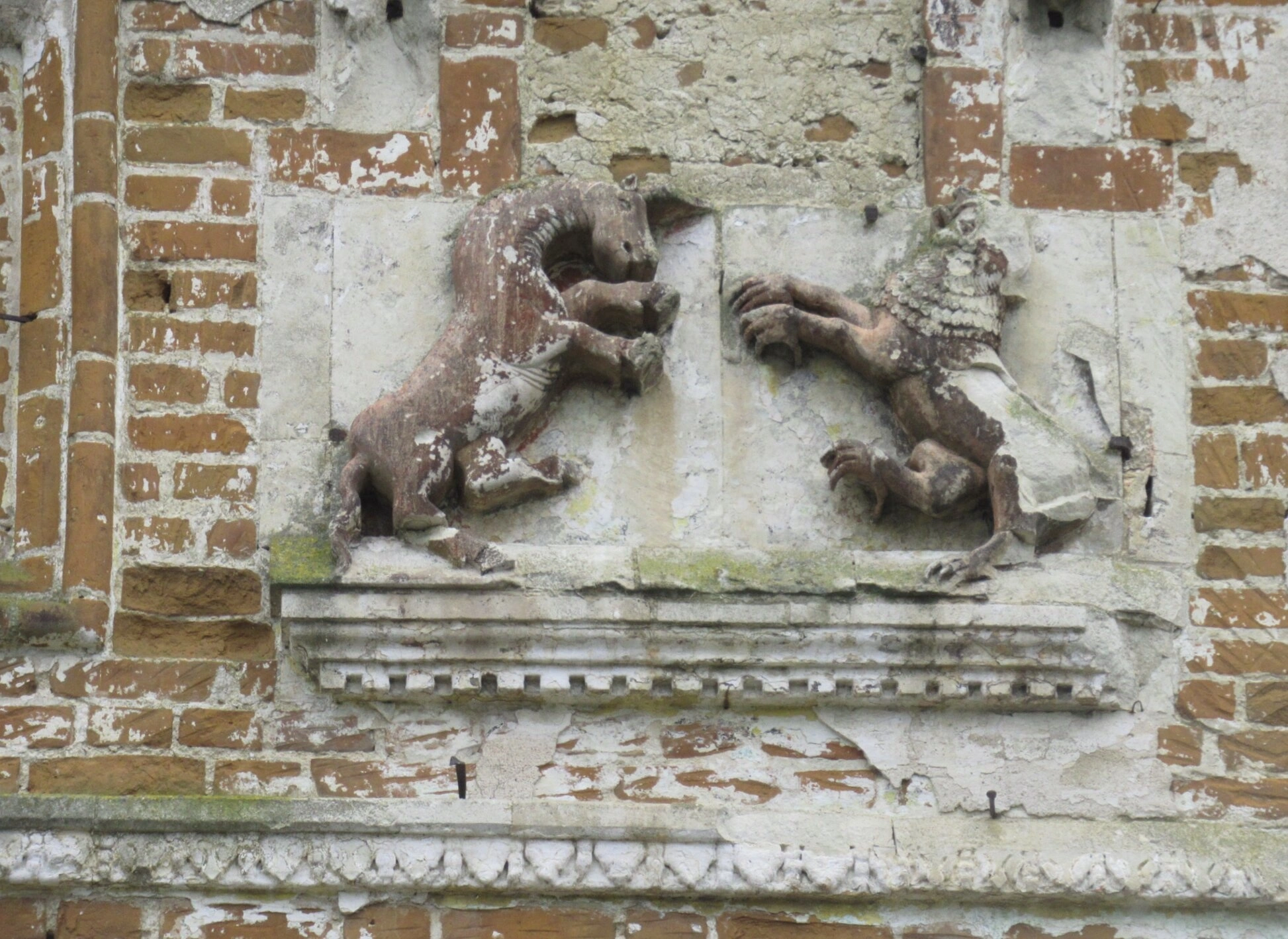 Изваянные из белого камня фигуры, напоминающие грифонов — стражей сокровенных знаний и символов бдительности в христианской традиции, — размещены на кирпичной стене храма. Барельеф демонстрирует высочайшее мастерство русских камнерезов XVII-XVIII веков. Несмотря на видимые следы времени и природного воздействия, композиция сохраняет свою монументальность и духовную выразительность.