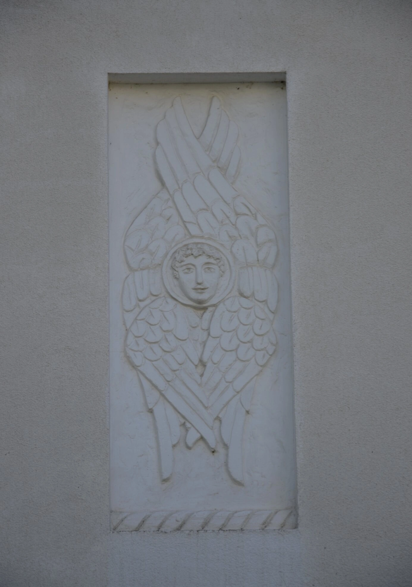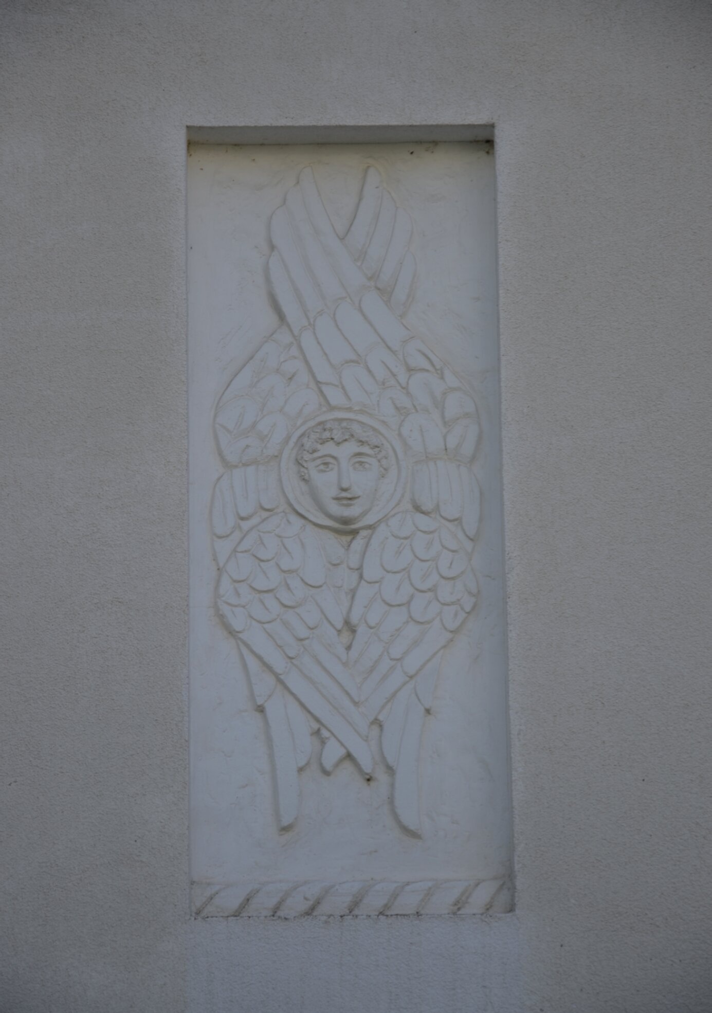 На представленной фотографии запечатлен барельеф серафима, расположенный в храме преподобного Серафима Саровского в городе Анапа. Храмовая архитектура включает данный рельефный образ в прямоугольной нише, выполненный в светлых тонах, что соответствует канонам православного церковного искусства.