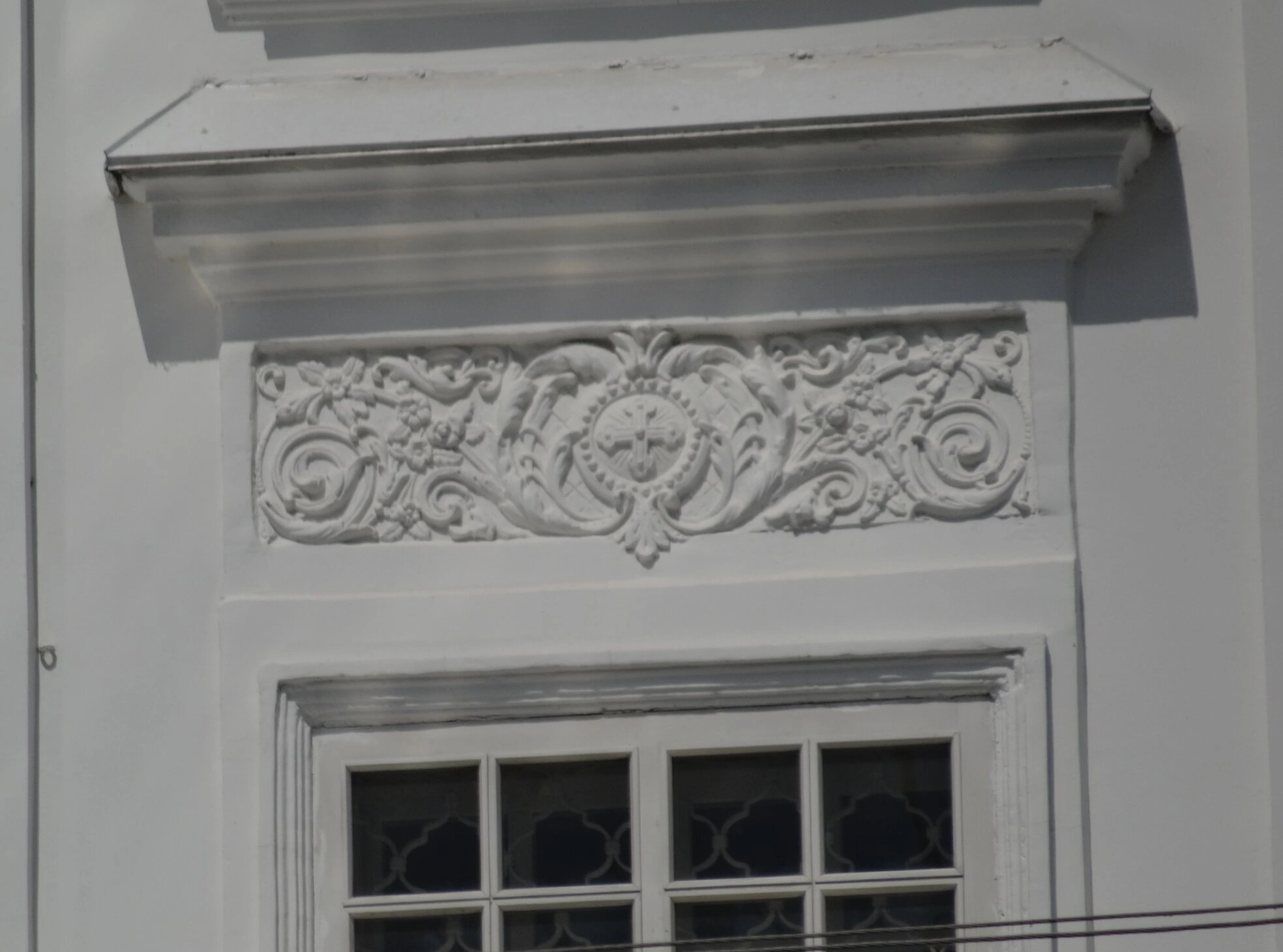 На представленной фотографии запечатлён фрагмент благолепного убранства Воскресенского собора, что в городе Шуе Ивановской области. Изображение демонстрирует искусно выполненный декоративный барельеф, расположенный на фасаде над оконным проёмом. Данный архитектурный элемент выполнен в классическом стиле и отличается тонкой, глубокой проработкой деталей.