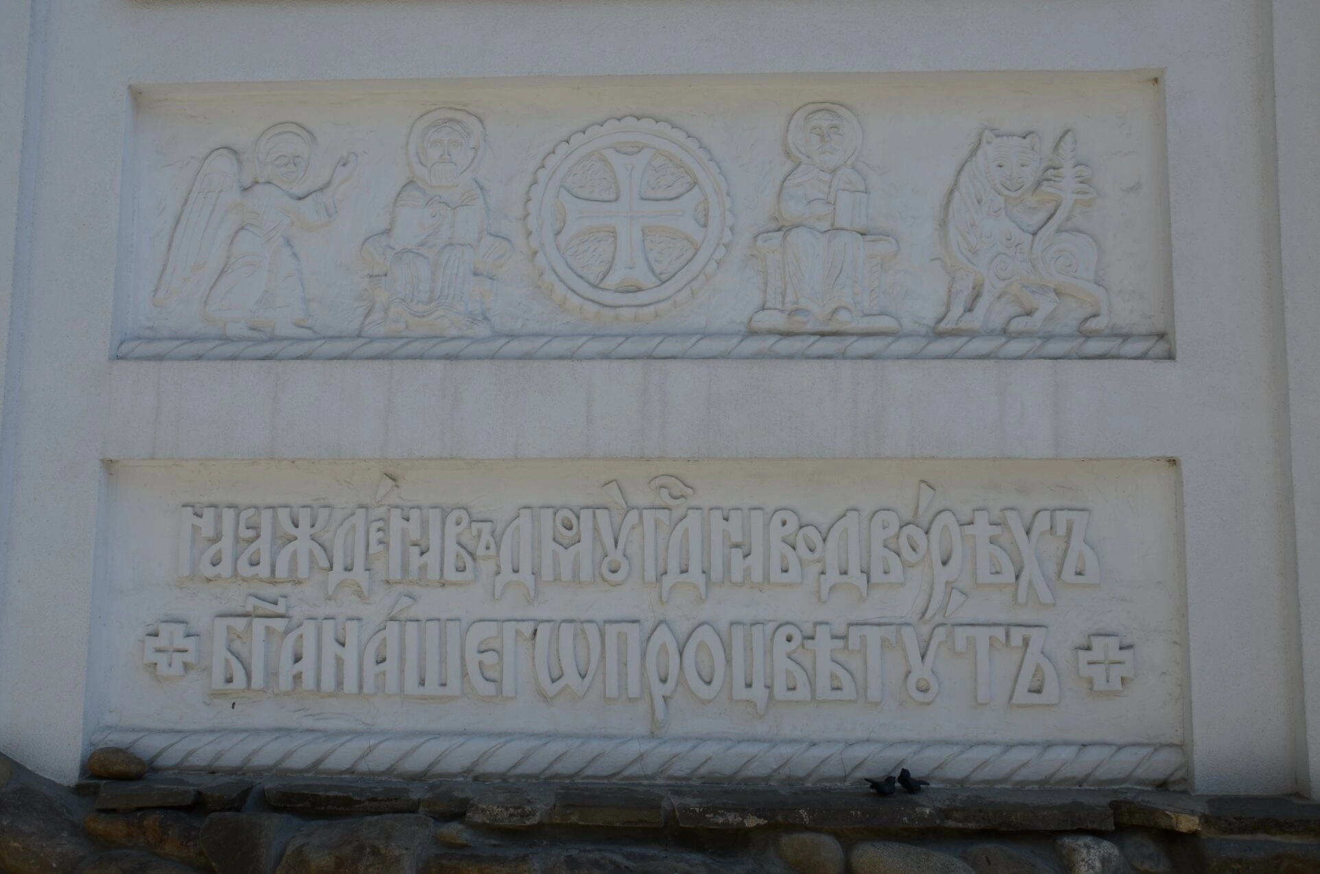 Нижний барельеф содержит старославянскую надпись, искусно высеченную в камне. Текст частично повреждён временем, однако в центральной части различимы слова: "...НАШЕГО ПРОЦВЬТУТЬ". Эта фраза может относиться к библейским текстам или молитвенным обращениям, характерным для православной традиции.
