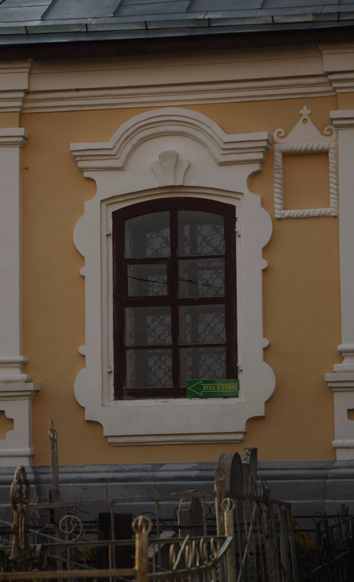 Важную смысловую нагрузку несёт табличка, установленная на подоконнике, с нанесённой надписью «ВХОД В ХРАМ» и направляющей стрелкой. В нижней части кадра виден металлический оградительный забор, а за ним — намогильные кресты и памятники, свидетельствующие о близости церковного кладбища, что является неотъемлемой частью истории многих древних православных приходов. Успенский храм в Николо-Рожке является выдающимся памятником церковной архитектуры и объектом культурного наследия Тверской земли.