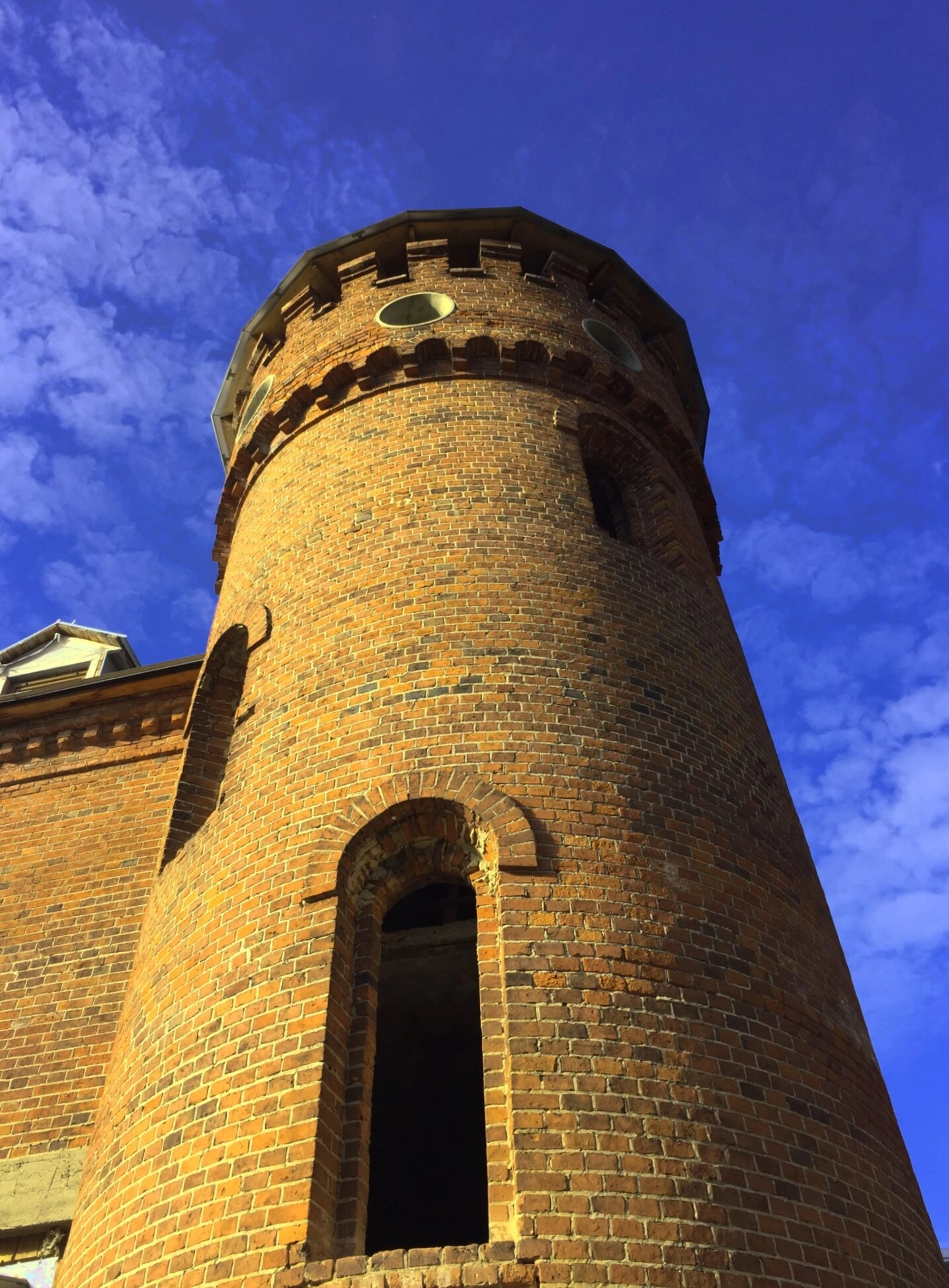 Фотография выполнена в ракурсе снизу вверх, что позволяет оценить монументальность сооружения и его устремлённость к небесам. На снимке башня изображена на фоне голубого неба с легкими облаками, что символично подчёркивает духовное предназначение сооружения. Отсутствие побелки на кирпичных стенах позволяет детально рассмотреть кладку и архитектурные элементы.