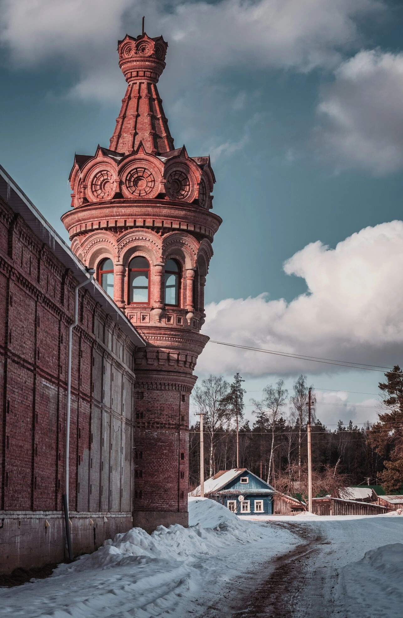 На представленной фотографии запечатлена одна из башен архитектурного ансамбля Свято-Никольского женского монастыря, что расположен на реке Сольбе в Ярославской области. Каменная башня, сложенная из красного кирпича, является характерным образцом монастырской фортификационной и хозяйственной архитектуры. Её строгий облик оживляют арочные оконные проёмы и лаконичный декоративный пояс в завершающей части.