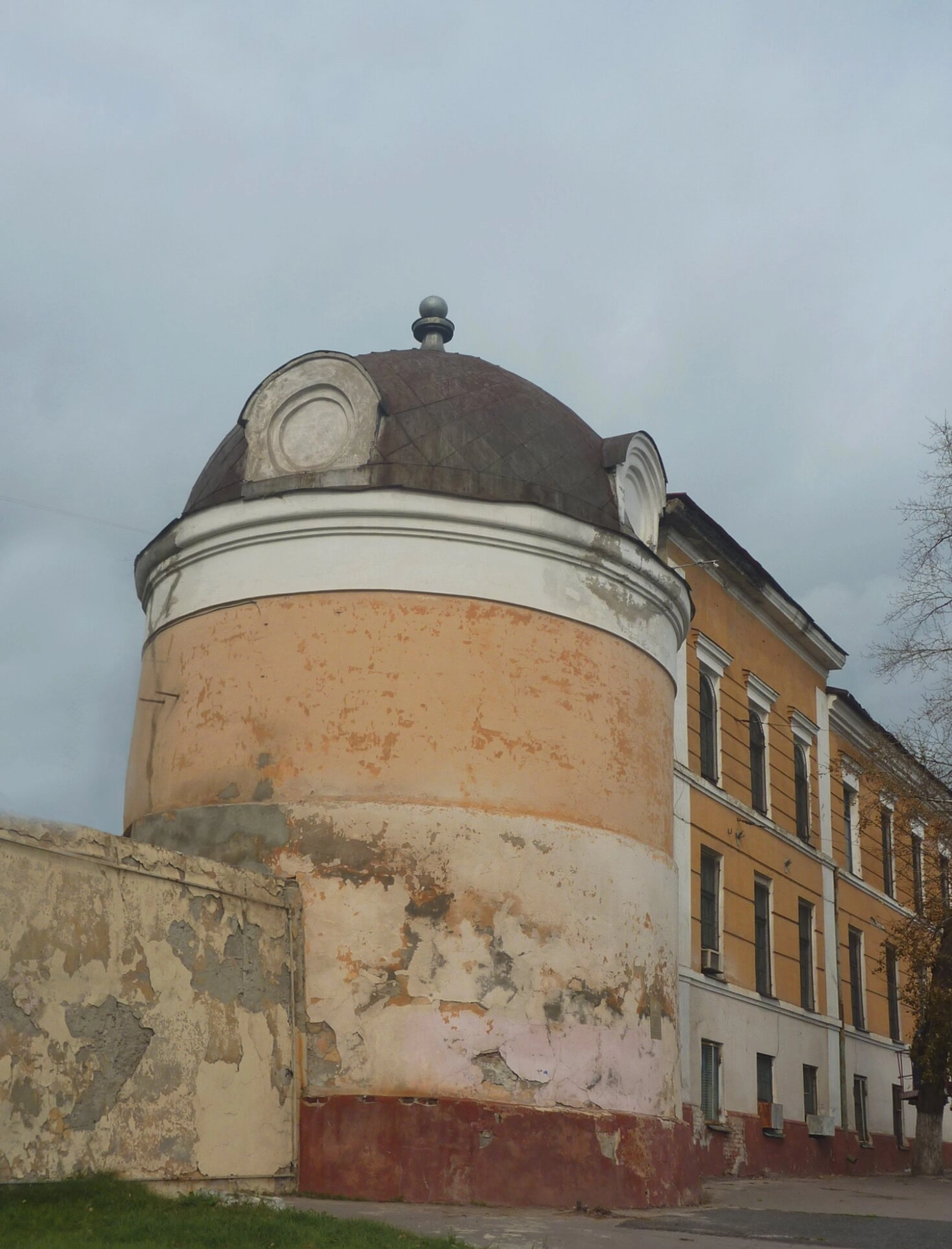 На представленной фотографии запечатлена историческая реликвия духовной жизни Курска — сохранившаяся башня ограды Курского Знаменского мужского монастыря, являющаяся памятником архитектуры XVII столетия. Эта каменная башня представляет собой немногим уцелевший фрагмент древней монастырской ограды, свидетельствующий о былой мощи и величии святой обители.