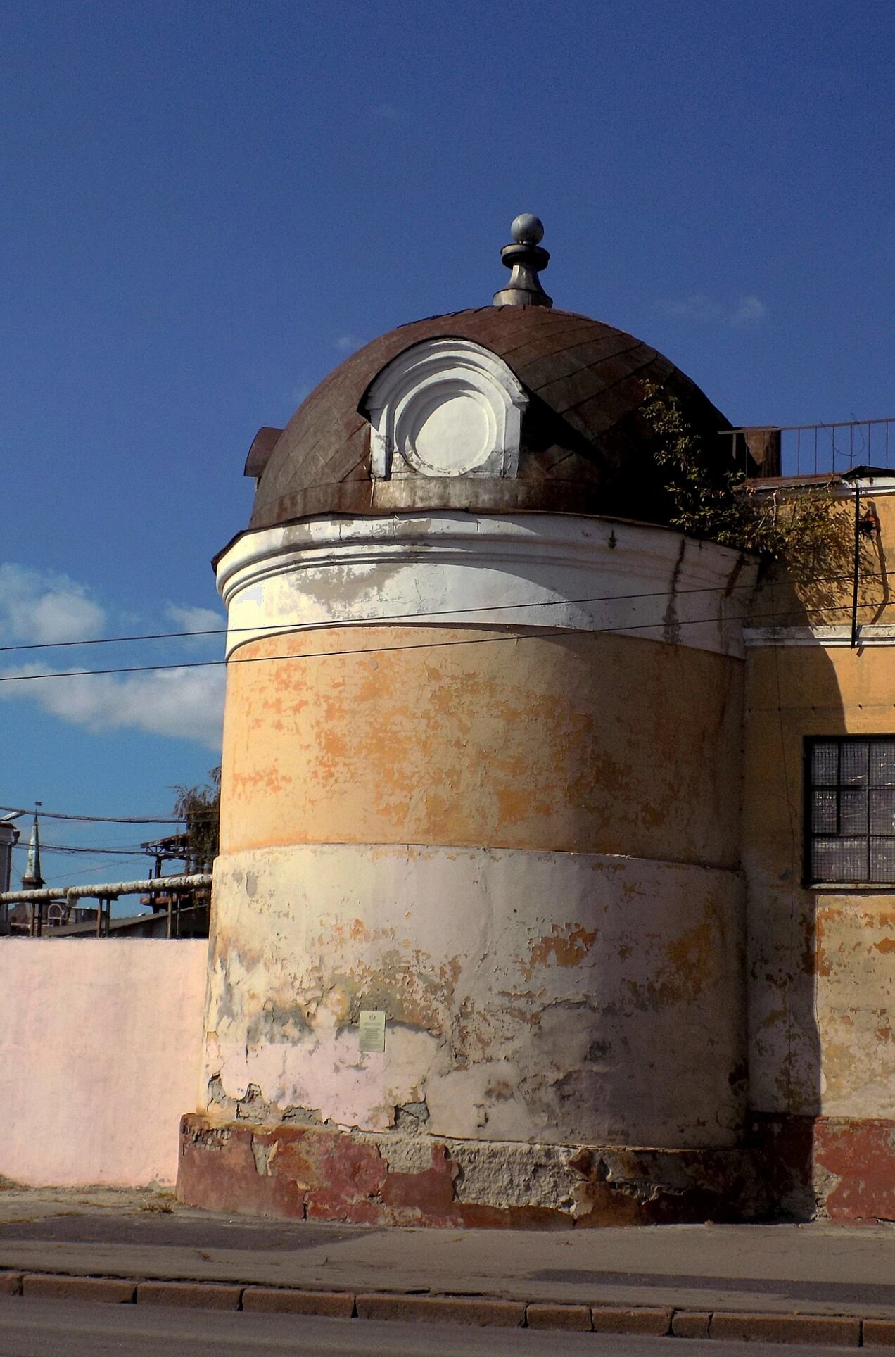 На представленной фотографии запечатлена одна из башен монастырской ограды Курского Знаменского мужского монастыря, являющаяся неотъемлемой частью архитектурного ансамбля этой старинной православной обители. Данная башня, выполненная в стиле классицизма, была возведена в середине XIX века вместе с сооружением новой каменной ограды, пришедшей на смену прежним деревянным укреплениям.