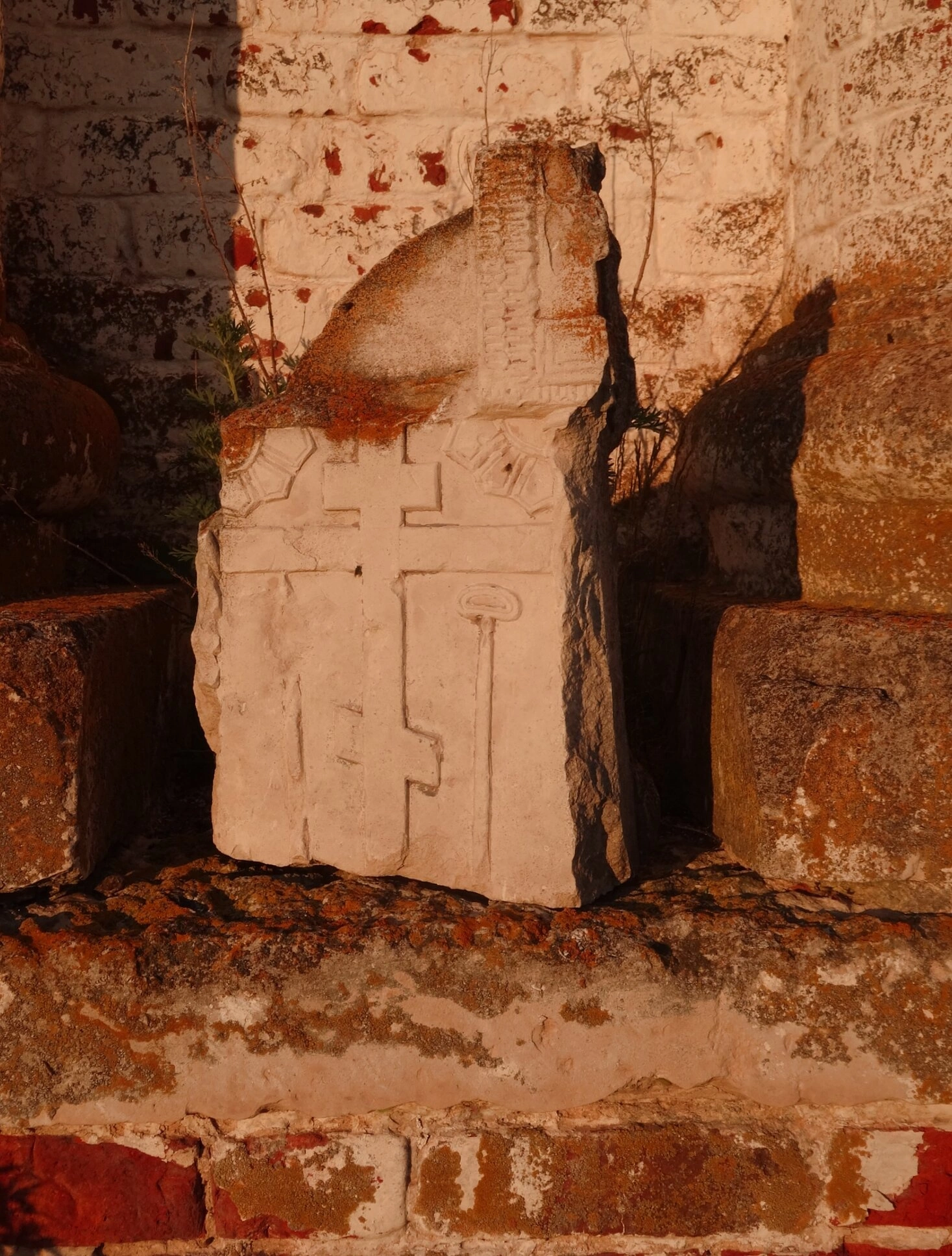 Резной белокаменный элемент, вероятно, представляет собой часть декоративного пояса или обрамления портала. Искусная работа древних мастеров демонстрирует традиционные для православного зодчества мотивы: геометрические плетёнки, стилизованные растительные элементы, символизирующие Древо Жизни, а возможно, и элементы зооморфных изображений, несущих глубокую символическую нагрузку в украшении Дома Божия.
