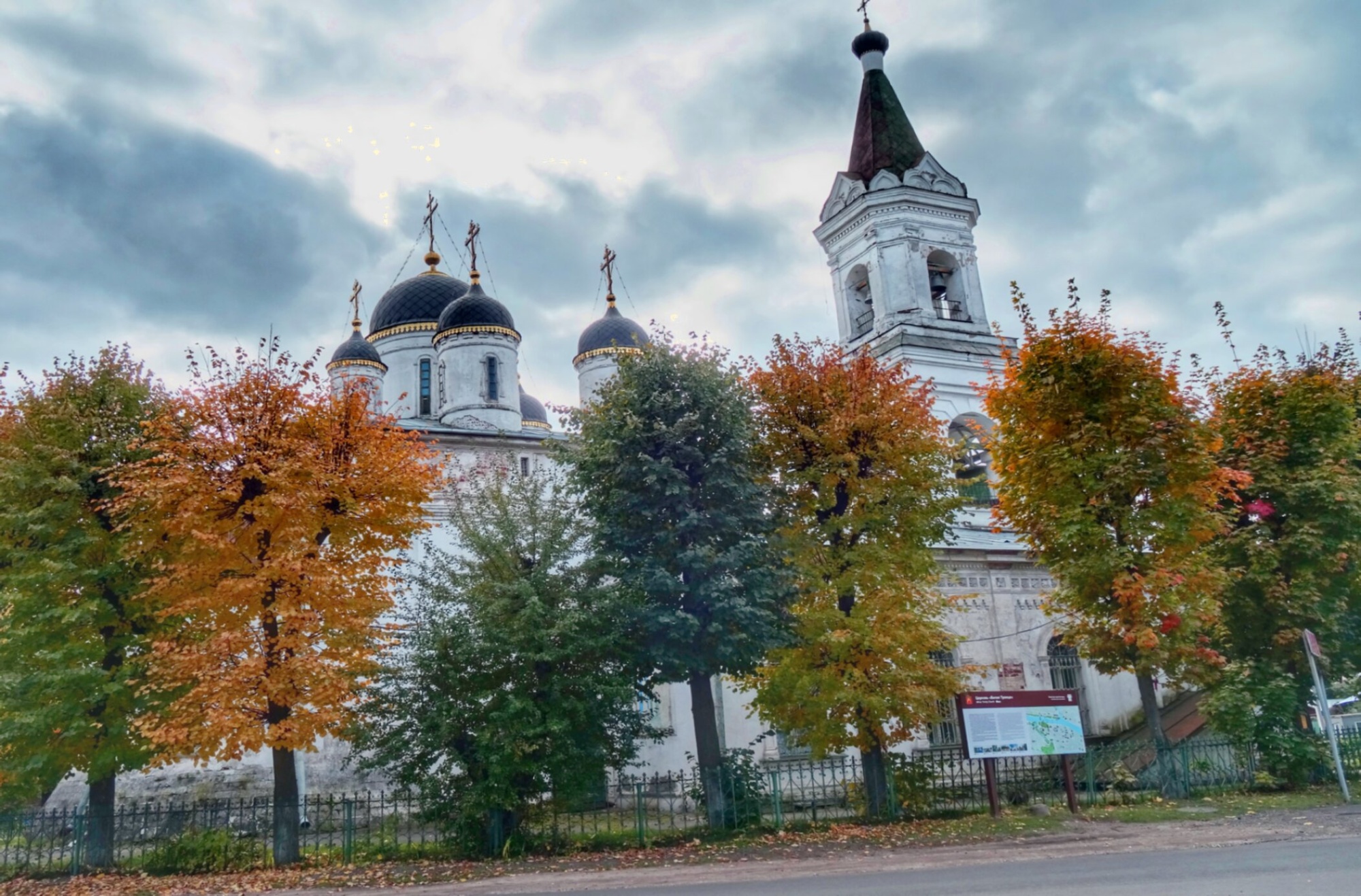 На представленной фотографии запечатлён величественный Белый Троицкий собор, являющийся одной из древнейших православных святынь Твери. Храм располагается в историческом центре города по адресу: улица Троицкая, дом 38. Снимок выполнен в погожий осенний день, о чём свидетельствуют золотые кроны деревьев, обрамляющих соборную площадь и создающих особую, благоговейную атмосферу.