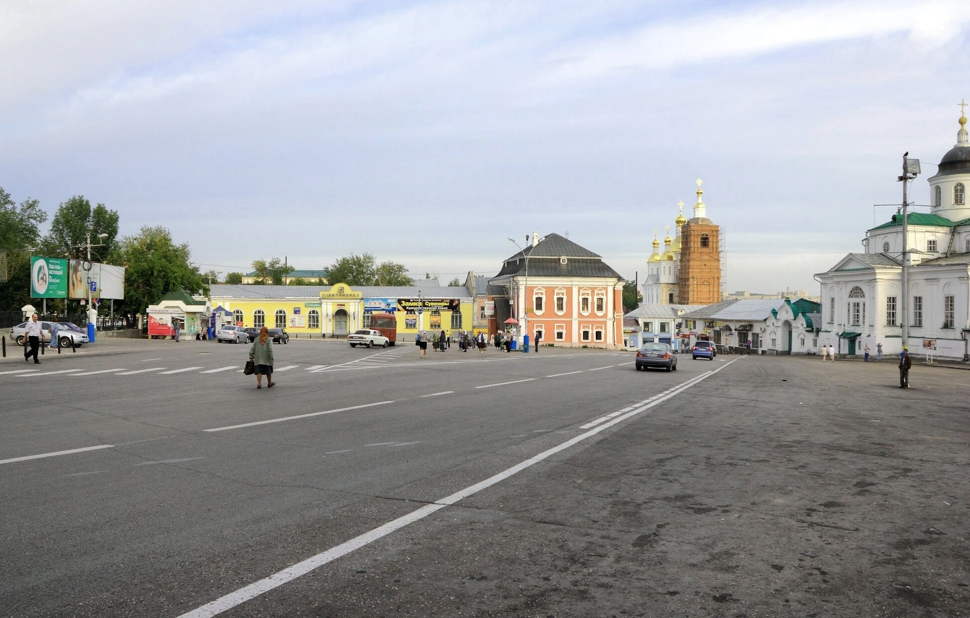 В левой части снимка величественно располагается пятиглавый Воскресенский собор, построенный в 1814-1842 годах в честь победы русского народа в Отечественной войне 1812 года. Этот кафедральный собор, созданный по проекту архитектора Михаила Коринфского, является доминантой всей площади и признанным памятником архитектуры федерального значения.