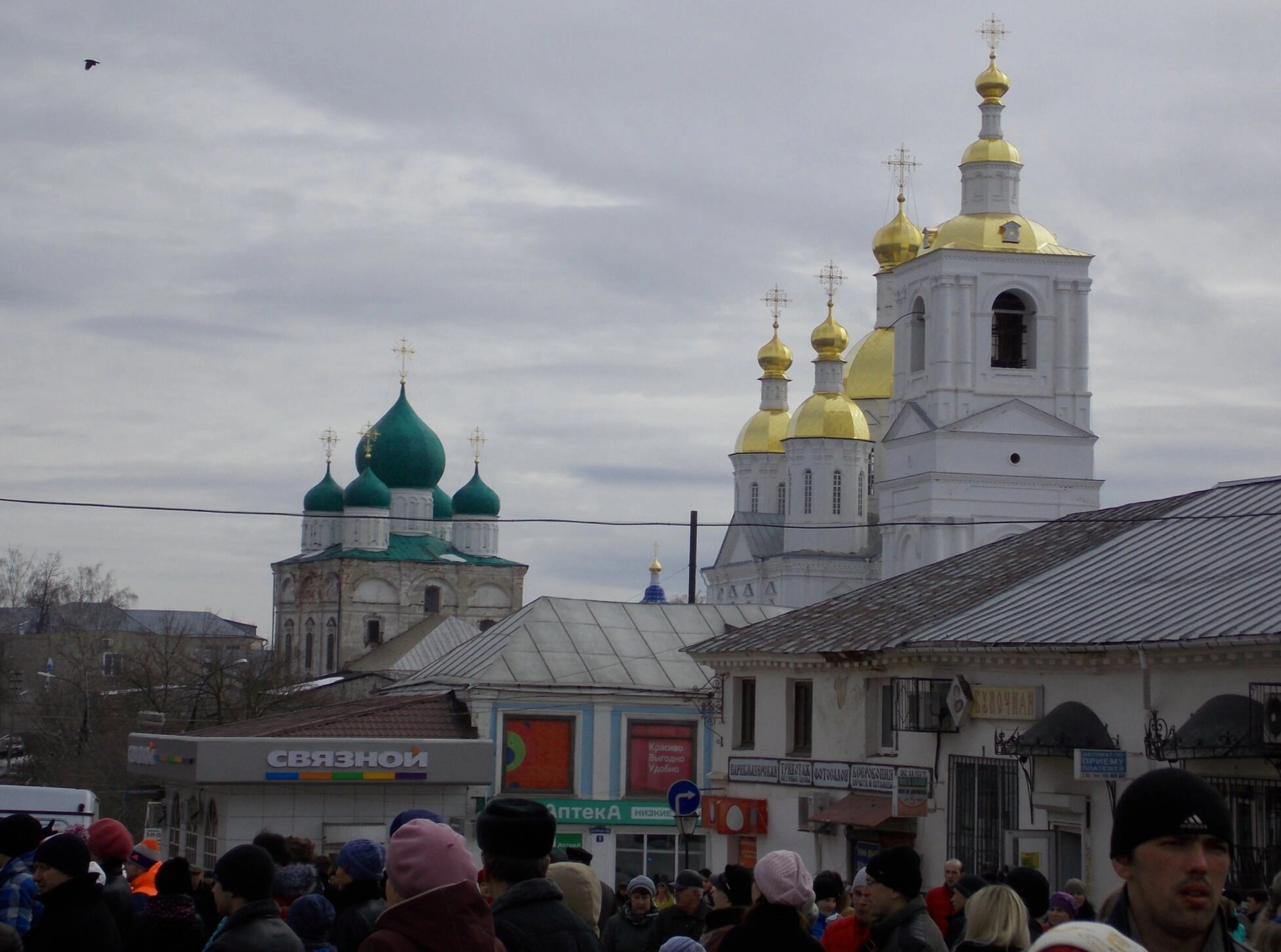 На переднем плане фотографии видна оживлённая городская жизнь: люди, спешащие по своим делам, современные вывески магазинов. Однако взгляд невольно обращается к духовному центру города – благолепному храму в честь Благовещения Пресвятой Богородицы. На заднем плане просматривается ещё один православный собор, свидетельствующий о богатой духовной истории Арзамаса.