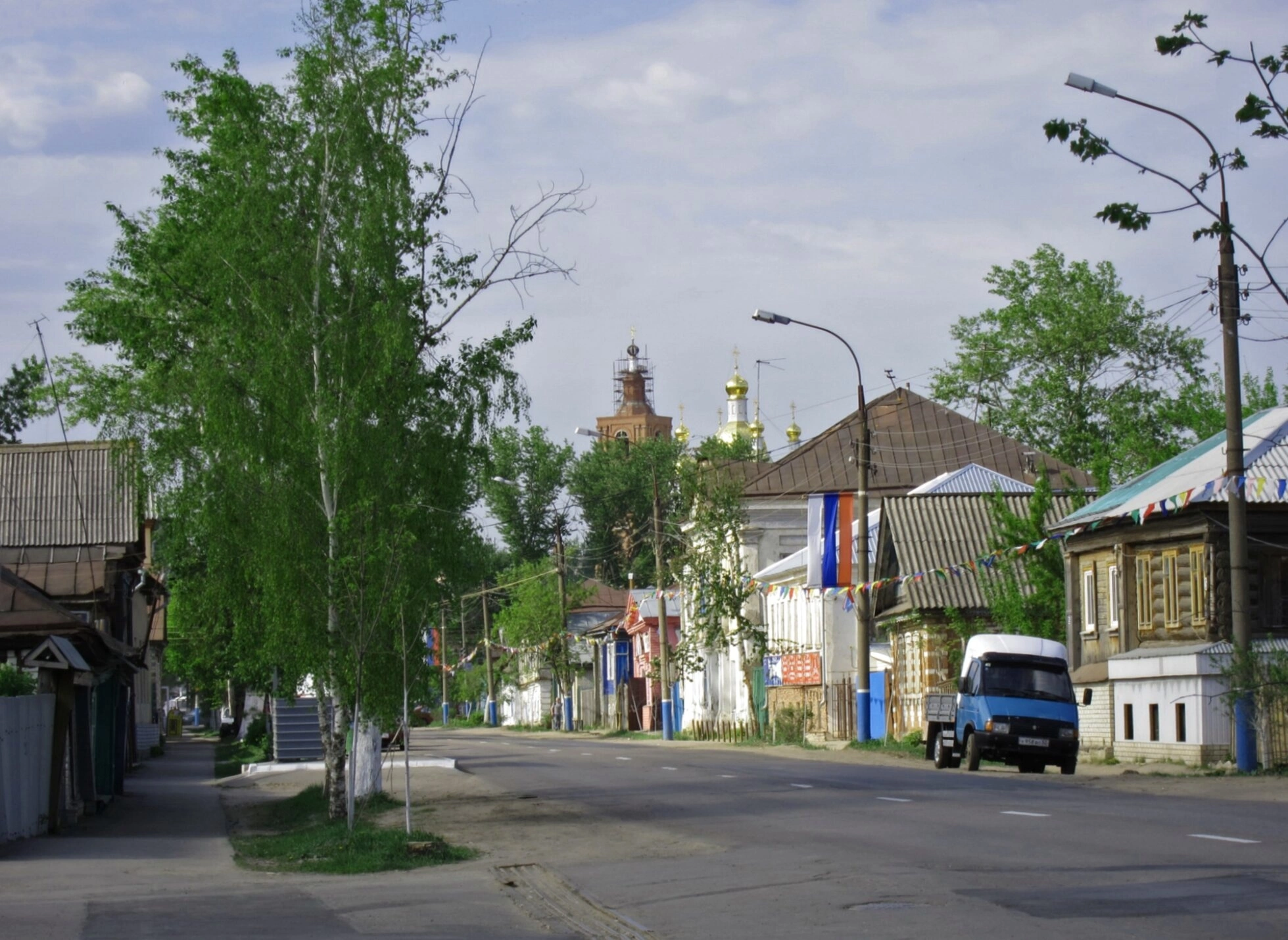 На фотографии запечатлен вид одной из старейших улиц Арзамаса – улицы Ленина, где на заднем плане, величественно возвышаясь над городской застройкой, видны купола и колокольня Благовещенской церкви. Этот храм, освященный в честь Благовещения Пресвятой Богородицы, является одной из архитектурных доминант исторического центра города и ценным памятником церковного зодчества.