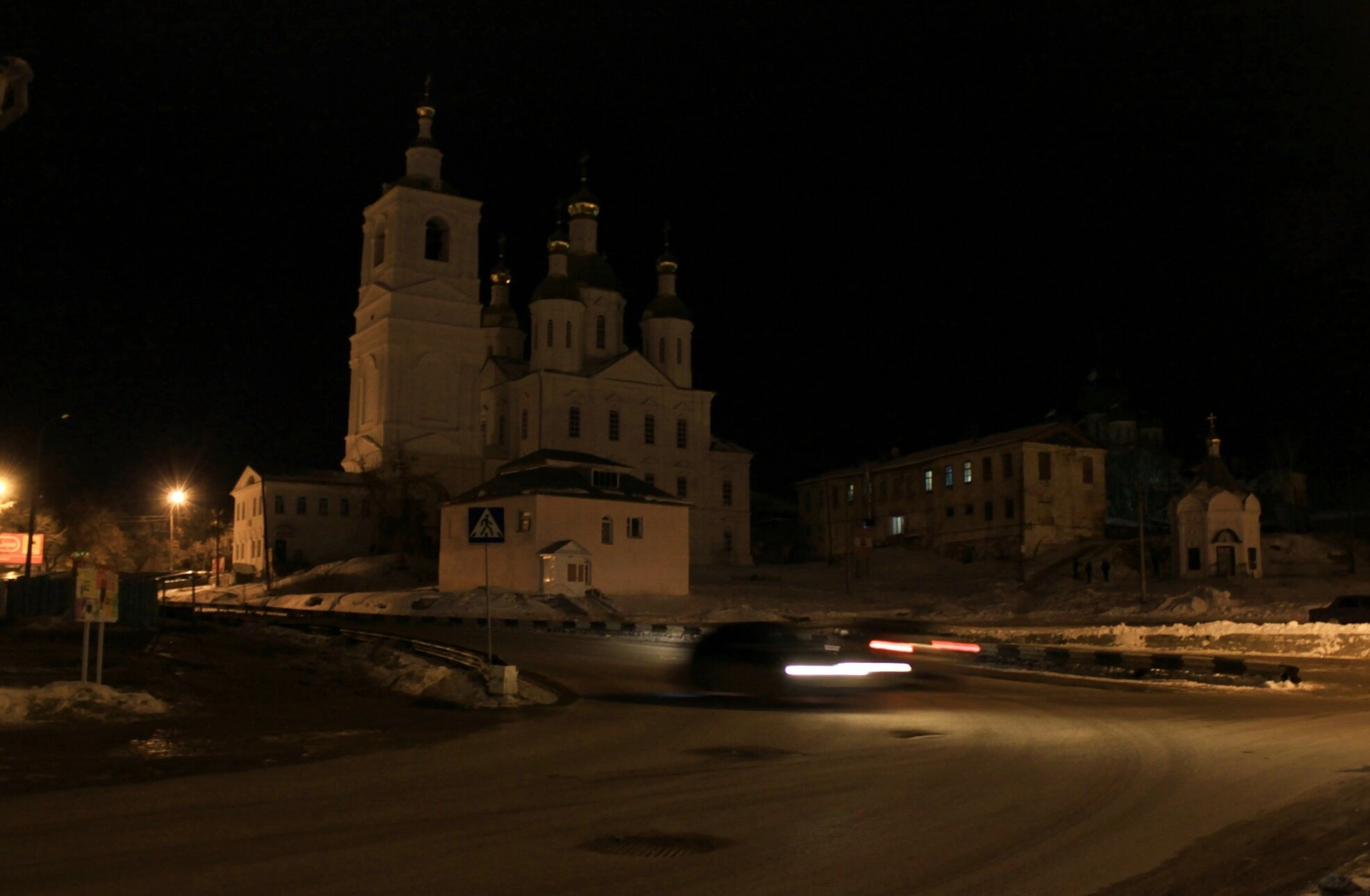 На переднем плане фотографии видны динамичные световые следы от проезжающего автомобиля, которые добавляют кадру особую выразительность и ощущение движения. Этот художественный прием позволяет создать гармоничное сочетание вечного и неизменного - храма, и преходящего - быстротечной мирской жизни.