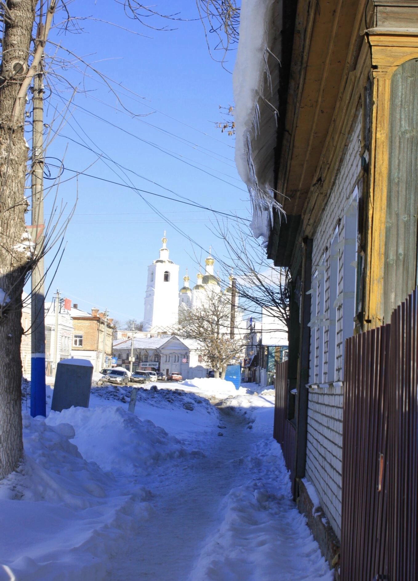 На переднем плане изображена заснеженная улица исторической части города. Справа виднеется традиционный деревянный дом с характерным для русского зодчества кирпичным цоколем, крыша которого украшена сверкающими на солнце ледяными сосульками. Рядом расположен коричневый забор, добавляющий колорит городской среде.