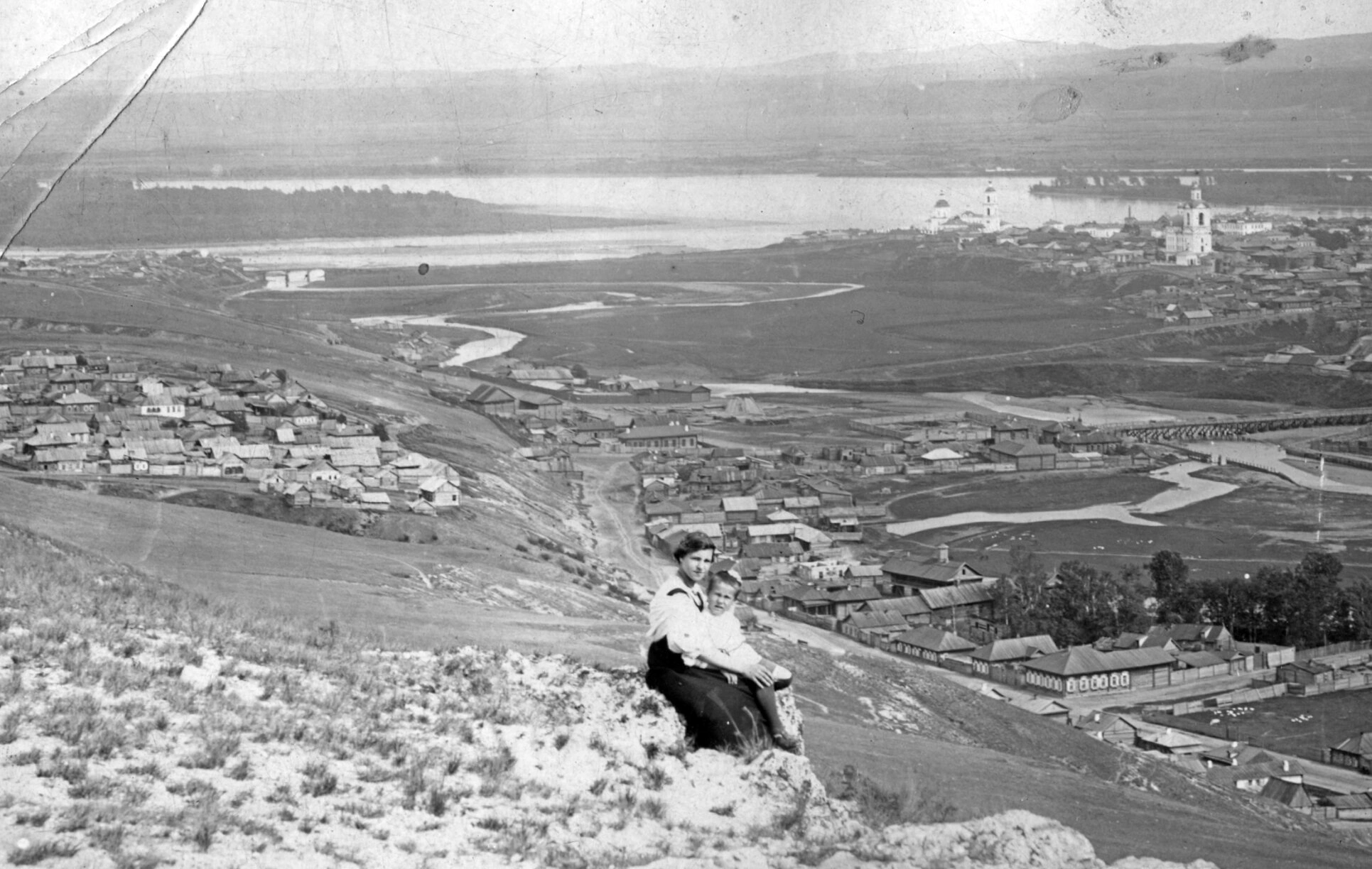 На представленной исторической фотографии запечатлен вид города Красноярска начала XX века, снятый с вершины Караульной горы. На переднем плане изображены местные жители — мужчина и мальчик, расположившиеся на склоне, откуда открывалась величественная панорама губернского города.