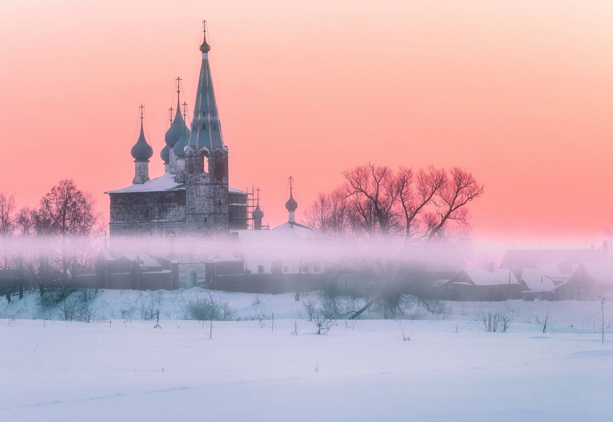 Особую атмосферу снимку придают зимние сумерки, когда небо окрашено в нежные пастельные тона — от светло-оранжевого до розового и сиреневого. Утренний туман, окутывающий нижнюю часть храма и окружающие деревянные дома, создаёт ощущение таинственности и благоговения перед святыней. Покрытый снегом передний план и silhouettes оголённых деревьев на заднем плане подчёркивают суровую красоту русского зимнего пейзажа.