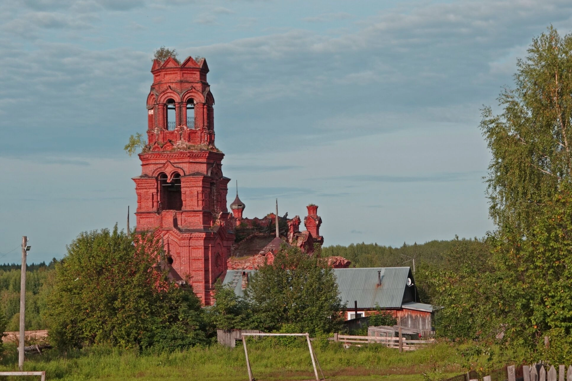 Справа, сквозь ветви деревьев, просматривается крыша деревенского дома, напоминая о том, что село Покча, основанное в XV веке как форпост Московского государства на Урале, продолжает жить. Благовещенская церковь, построенная в XIX веке, была духовным центром для местных жителей, а ныне является немым свидетелем истории и объектом культурного наследия. Небо над руинами, частично затянутое облаками, но с проглядывающими лучами света, создаёт атмосферу тихой печали и надежды на возрождение.