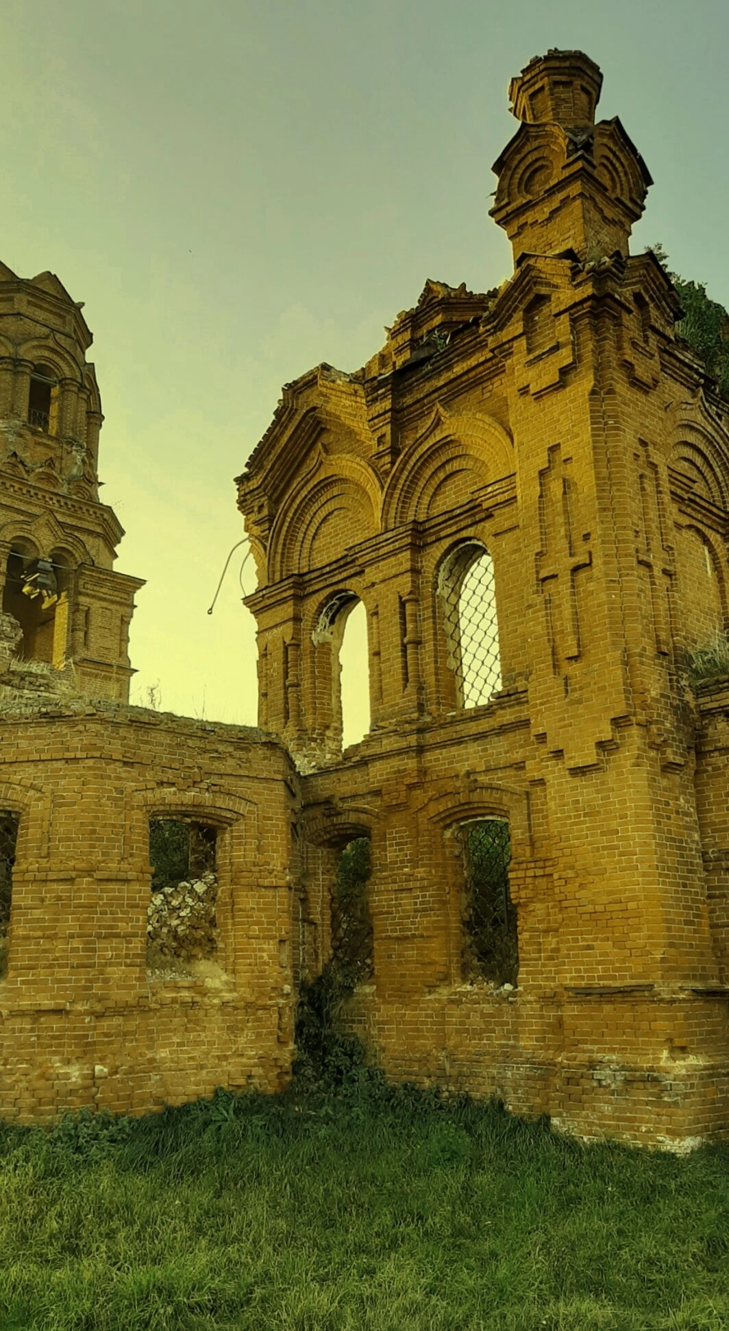 Фотография сделана в лучах естественного света, вероятно, на закате или восходе, что придаёт красному кирпичу тёплый, почти золотистый оттенок. Этот свет символично подчёркивает неземную красоту памятника, его тихую и величавую печаль. Руины храма молчаливо свидетельствуют о временах расцвета и упадка, оставаясь немым напоминанием о вере и истории этого края.