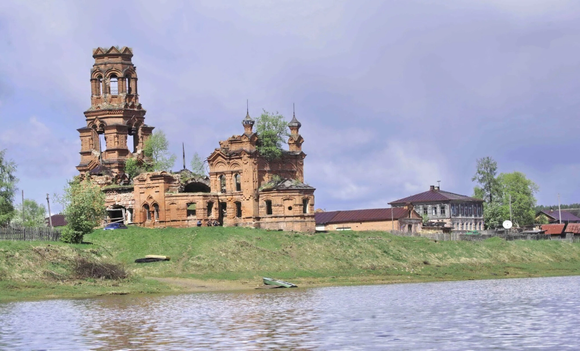 На фотографии запечатлена Благовещенская церковь, расположенная в селе Покча Чердынского района Пермского края. Этот храмовый комплекс, ныне пребывающий в повреждённом состоянии, представляет собой значительный памятник православной архитектуры и истории конца XVIII века.