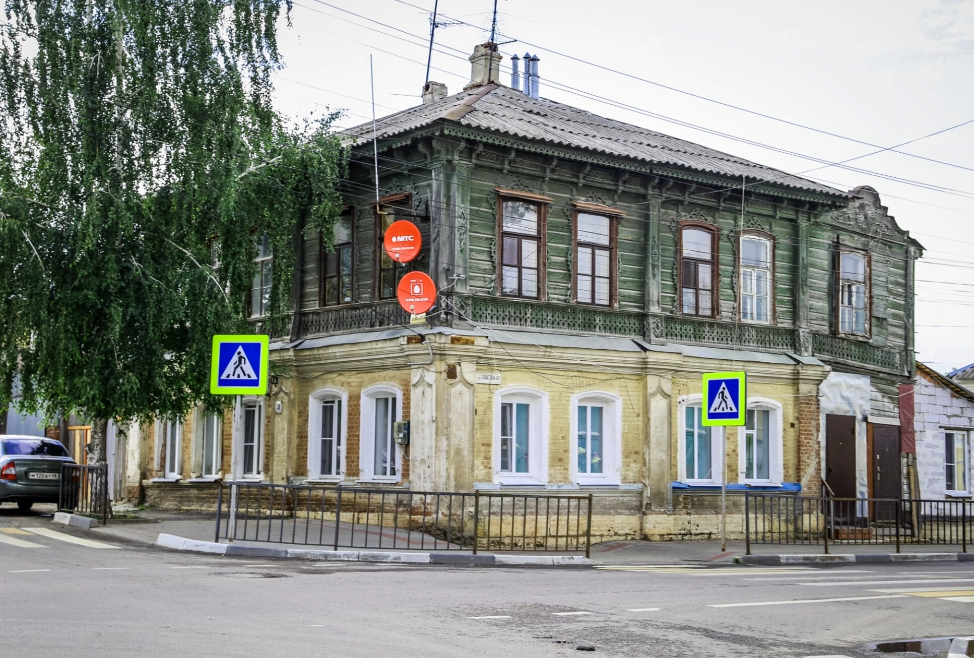 На углу здания установлены дорожные знаки «Пешеходный переход», указывающие на расположение храма в городской среде. Присутствие современных элементов, таких как вывески оператора связи, говорит о адаптации исторического здания к современным городским условиям.