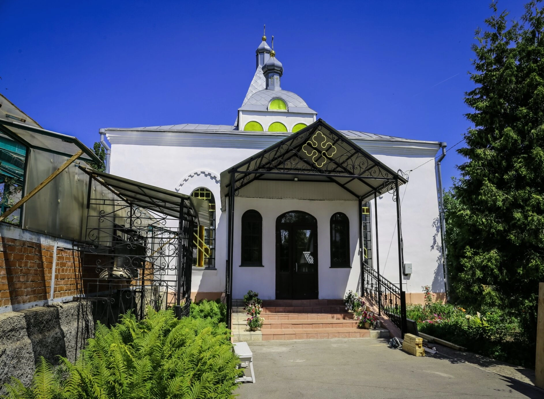 Главным архитектурным элементом является купол, увенчанный православным крестом, символизирующим веру и спасение. С левой стороны от основного здания видна современная пристройка из кирпича и стекла, гармонично вписанная в ансамбль. Перед входом в храм разбит ухоженный палисадник с зелеными насаждениями и цветами, а с правой стороны возвышается высокое хвойное дерево, дополняющее живописный вид.