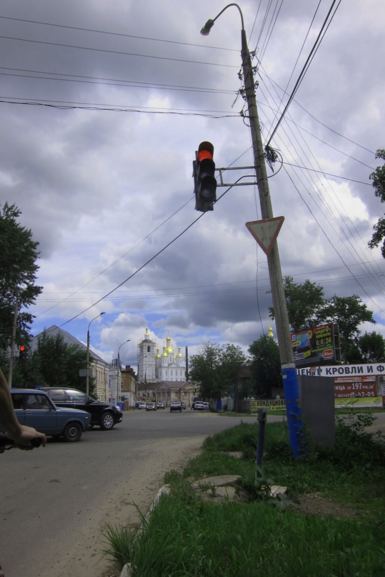 На представленной фотографии запечатлён живописный вид одной из улиц старинного города Арзамаса, ведущий взор к величественному Благовещенскому храму. На переднем плане справа виден уличный столб с светофором, горящим красным сигналом, и дорожным знаком «Уступи дорогу», что создаёт ощущение момента из повседневной городской жизни. Рекламный щит с вывесками местных заведений добавляет в композицию колорит современности.