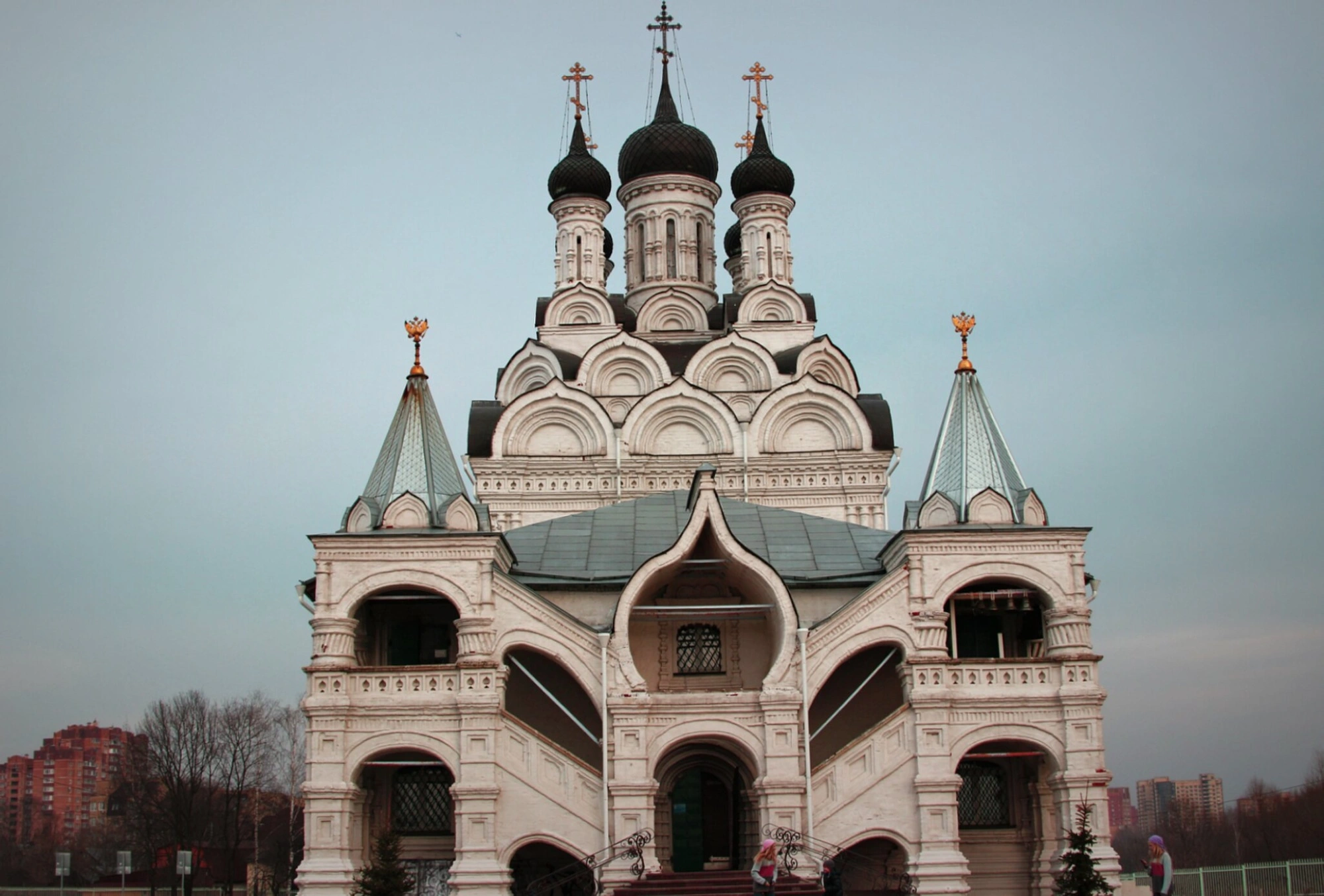 На фотографии храм предстает в своем великолепии, окруженный зимней природой. Черные купола с золотыми крестами контрастируют с пасмурным небом, а белокаменная кладка стен и ажурные детали декора подчеркивают изысканность архитектурных форм, созданных безвестными мастерами XVII столетия.