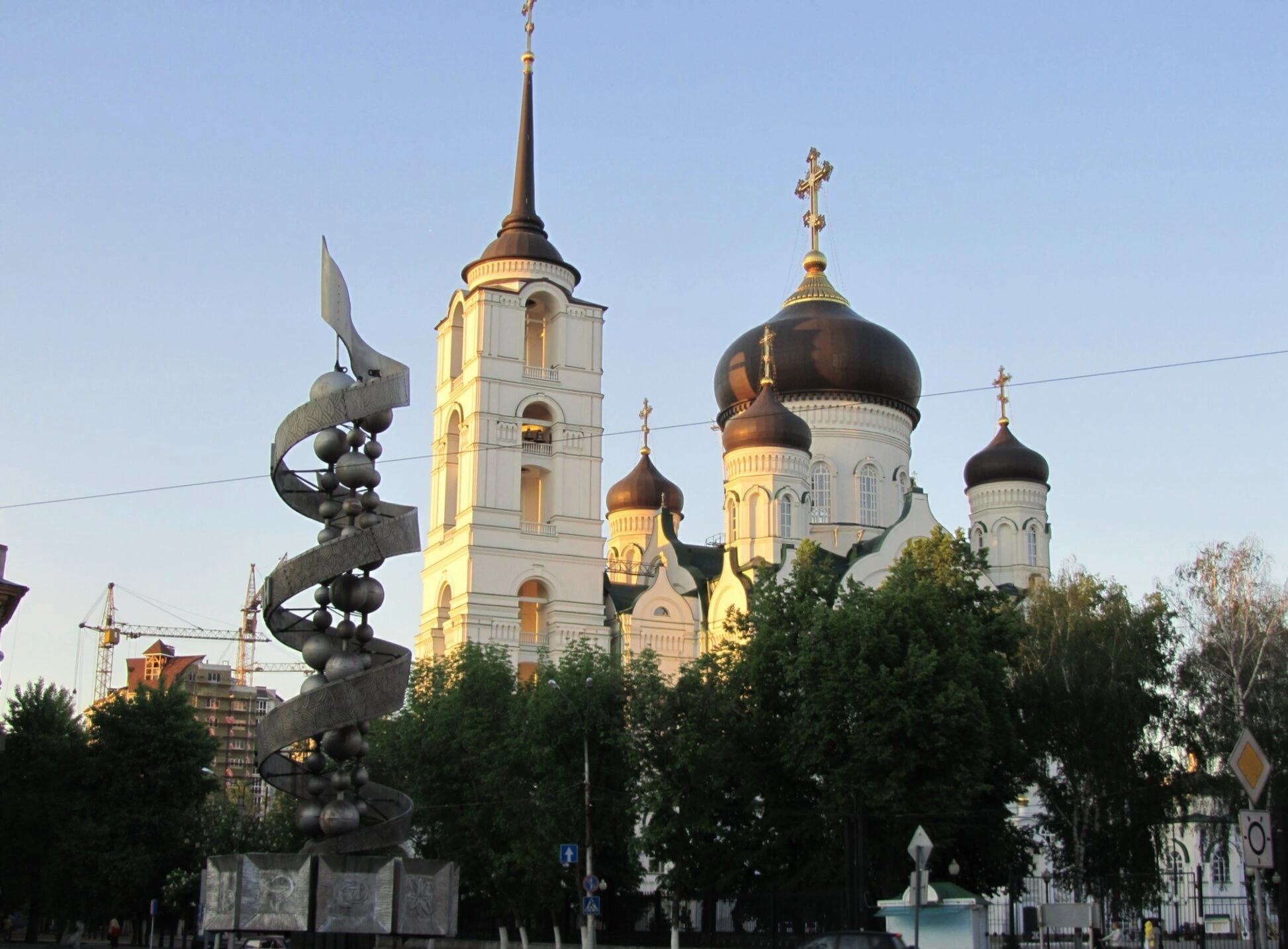 Таким образом, на снимке зафиксирован удивительный духовный и культурный симбиоз: древняя православная традиция, воплощённая в камне и куполах, и советский монумент, прославляющий научный прогресс. На заднем плане виднеющиеся строительные краны подчёркивают динамичное развитие современного Воронежа, который чтит свою историю и уверенно смотрит в будущее. Зелёные насаждения, окружающие собор и памятник, создают атмосферу умиротворения и гармонии, делая это место одним из самых узнаваемых в городском ландшафте.