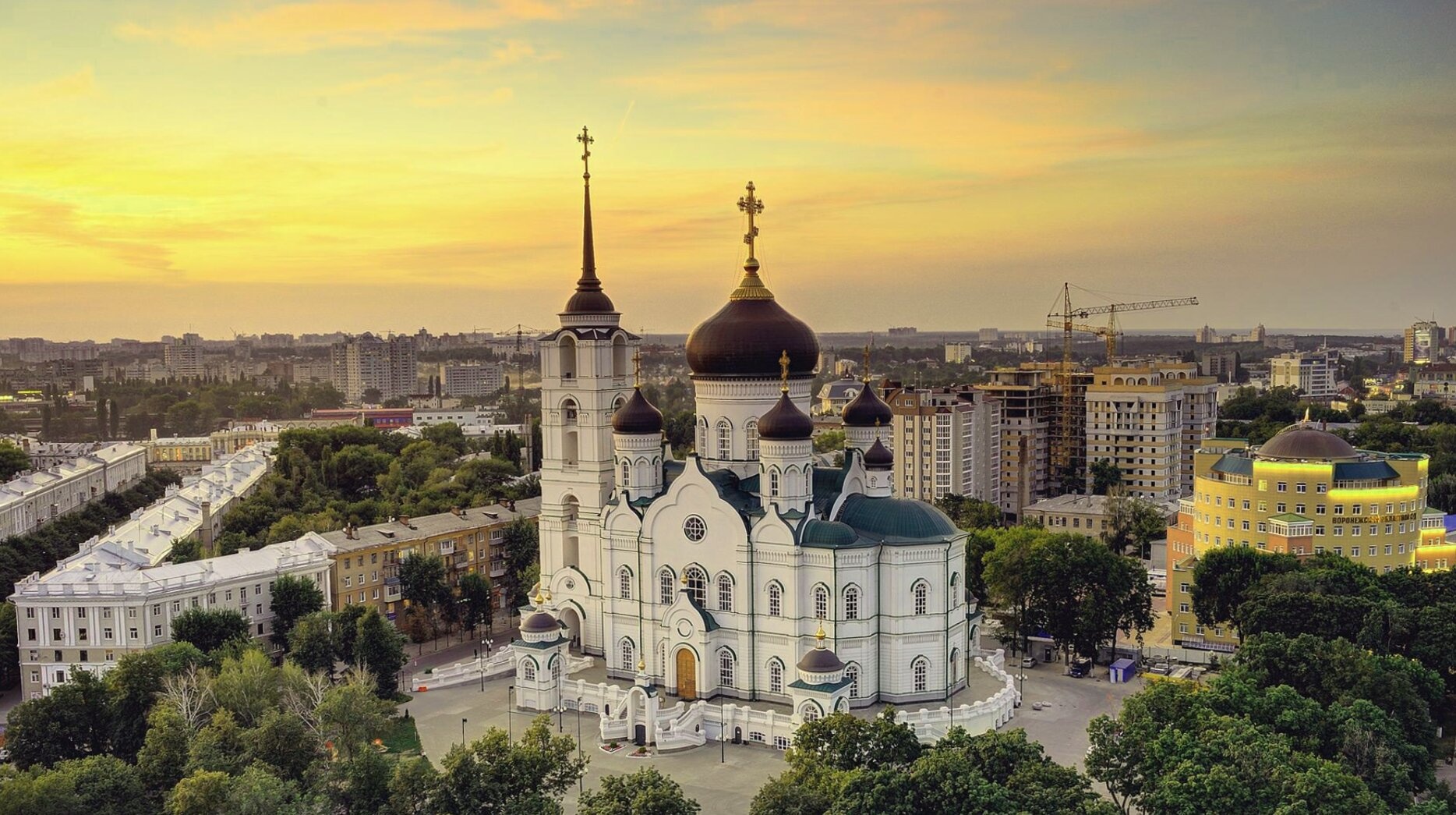 На фотографии запечатлён величественный Благовещенский кафедральный собор, являющийся кафедральным храмом Воронежской митрополии. Этот один из самых высоких православных храмов России возвышается в центре города, символизируя духовное возрождение Воронежа.