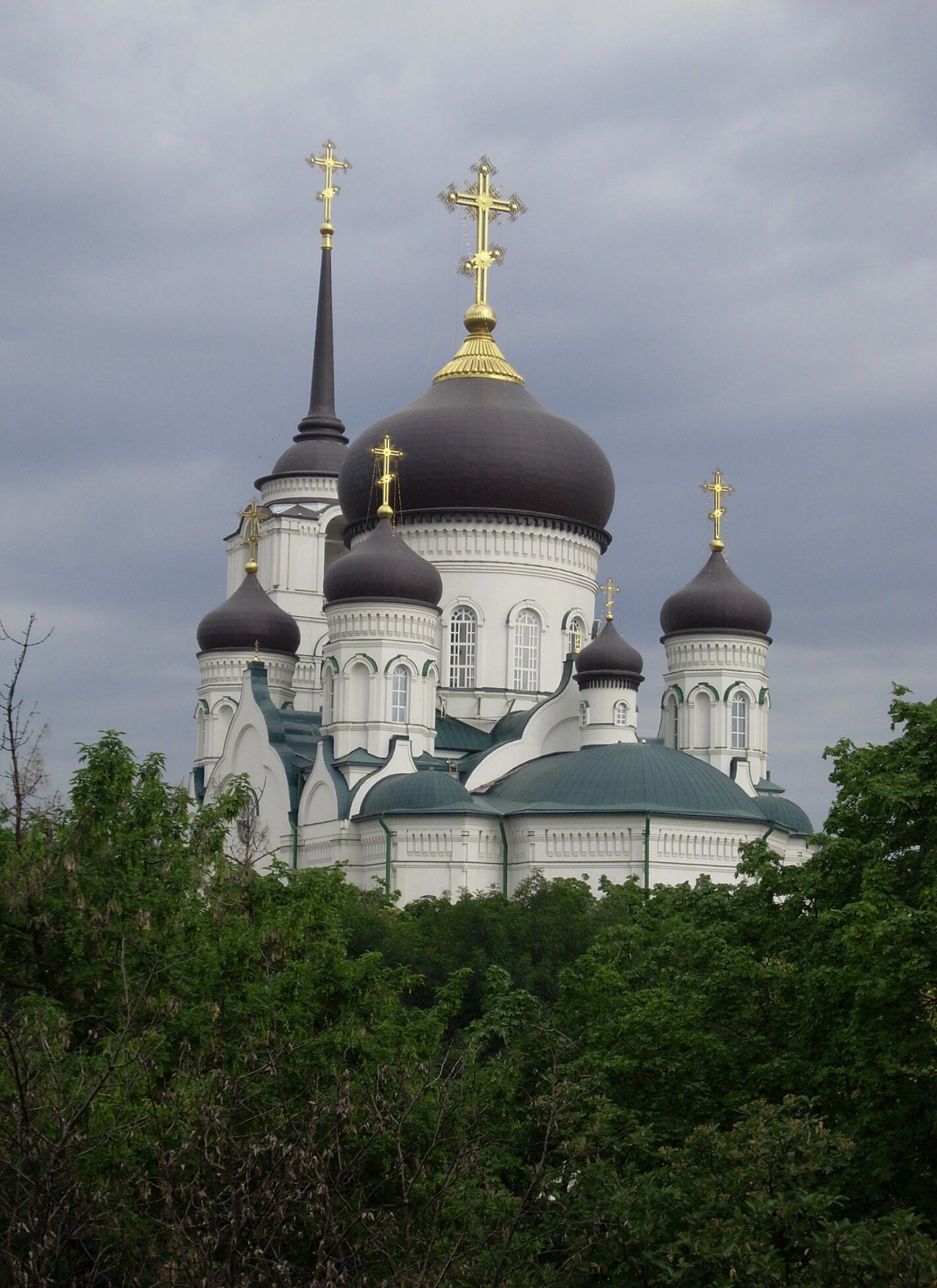 На представленной фотографии запечатлён величественный Благовещенский кафедральный собор, являющийся главным православным храмом города Воронежа и одной из духовных доминант всего Центрально-Чернозёмного региона России. Собор был возведён в русско-византийском стиле в период с 1998 по 2009 год по проекту архитектора В. П. Шевелёва на территории Первомайского сада, на месте исторического уничтоженного Благовещенского собора.